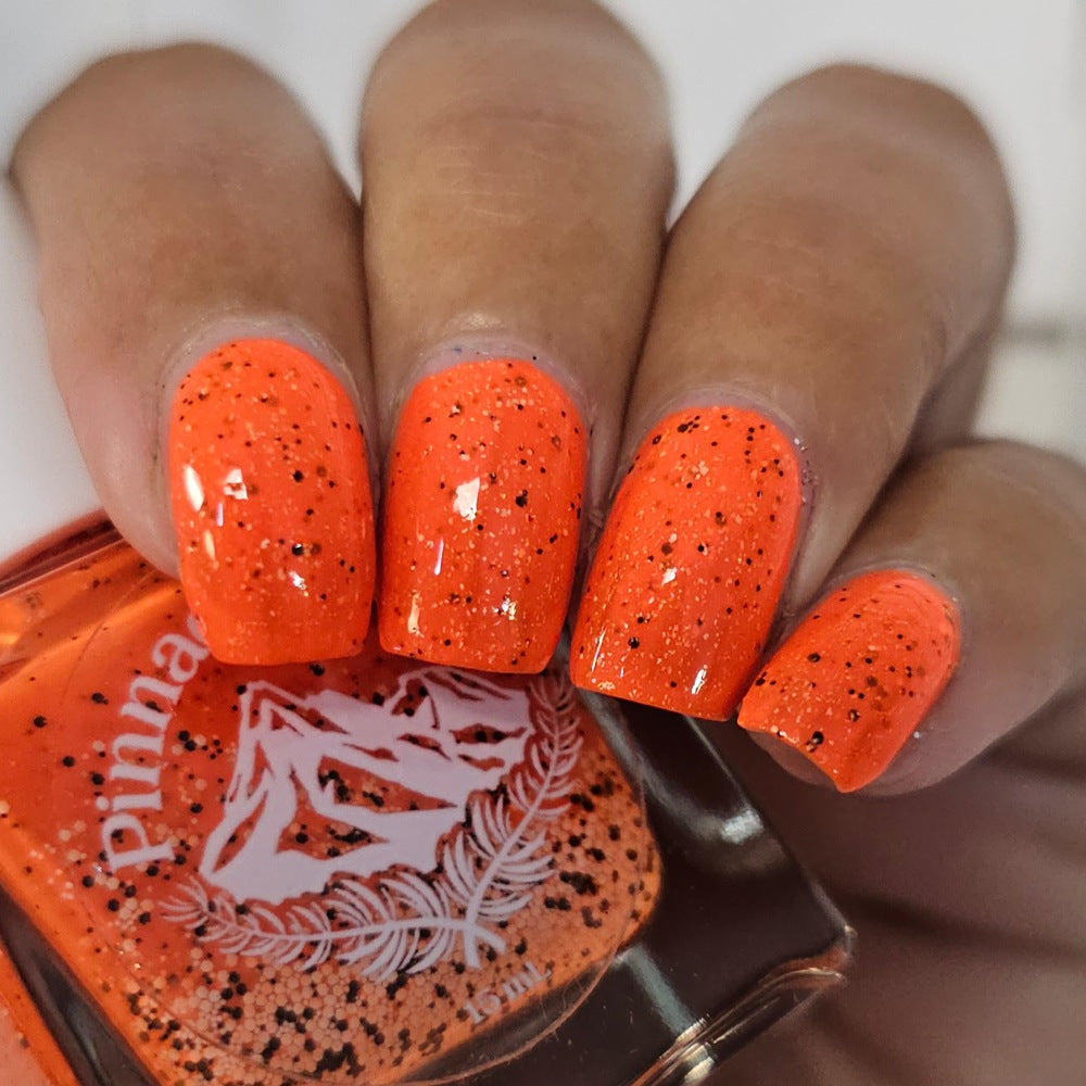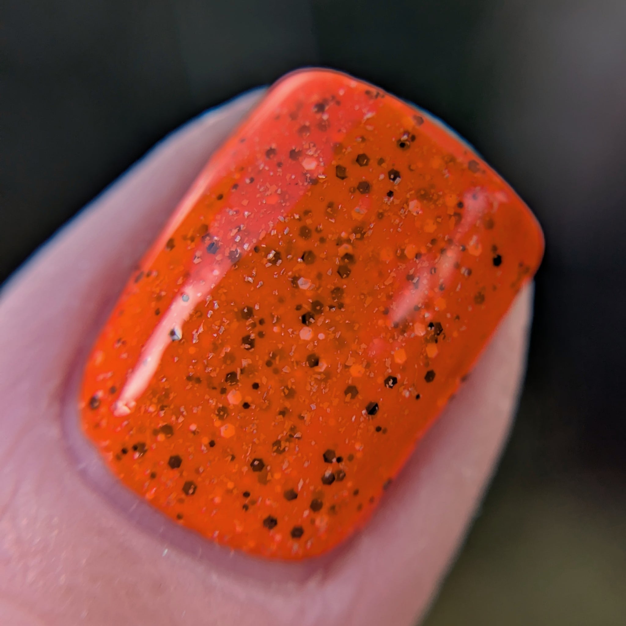 A neon orange base with small black and white glitter plus scattered holographic microflakes.