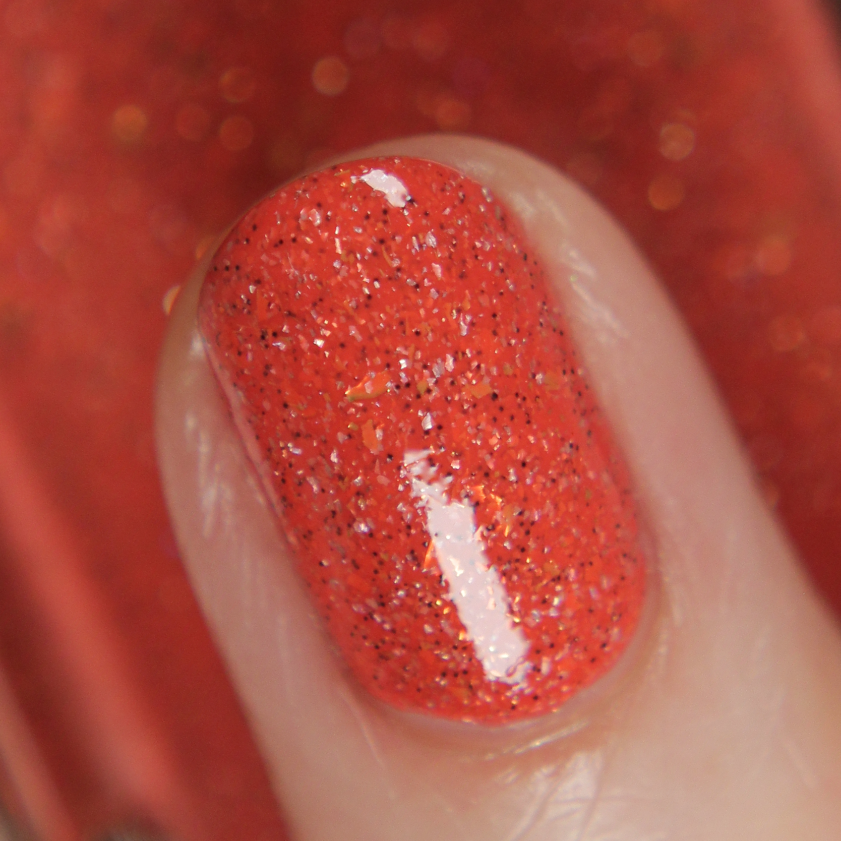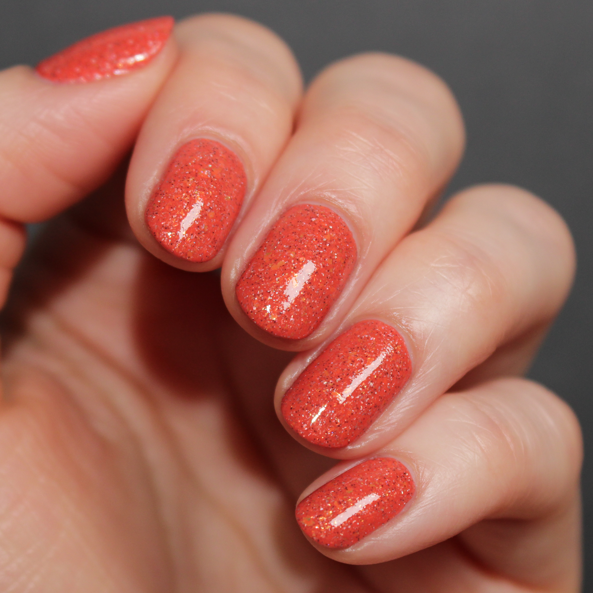 A vibrant coral-leaning orange crelly base with gold metallic flakes and scattered holographic microflakes and tiny black glitter.