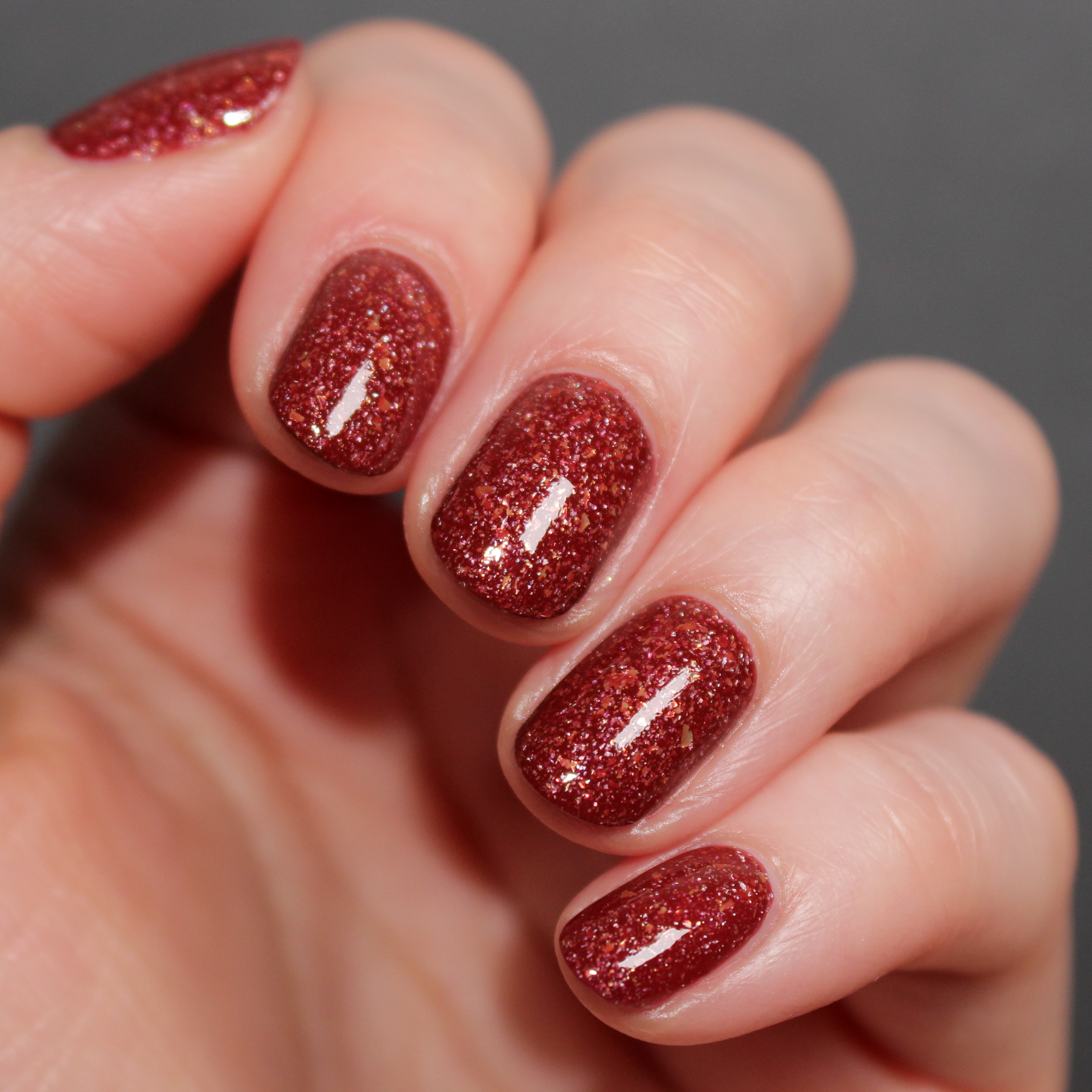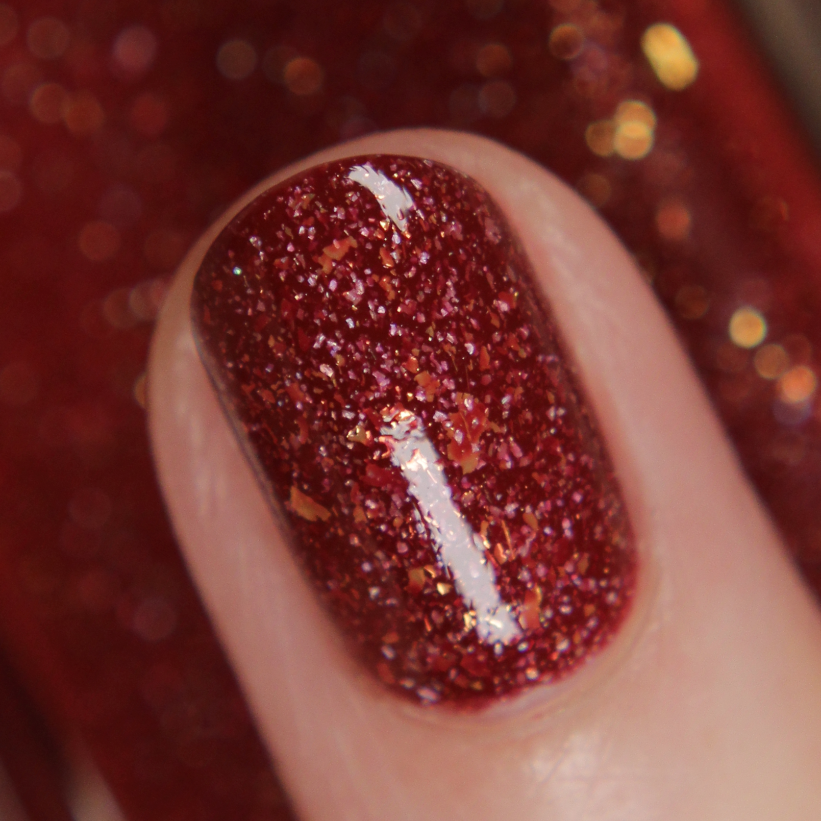 A warm brick red crelly base with gold metallic flakes and scattered holographic microflakes.
