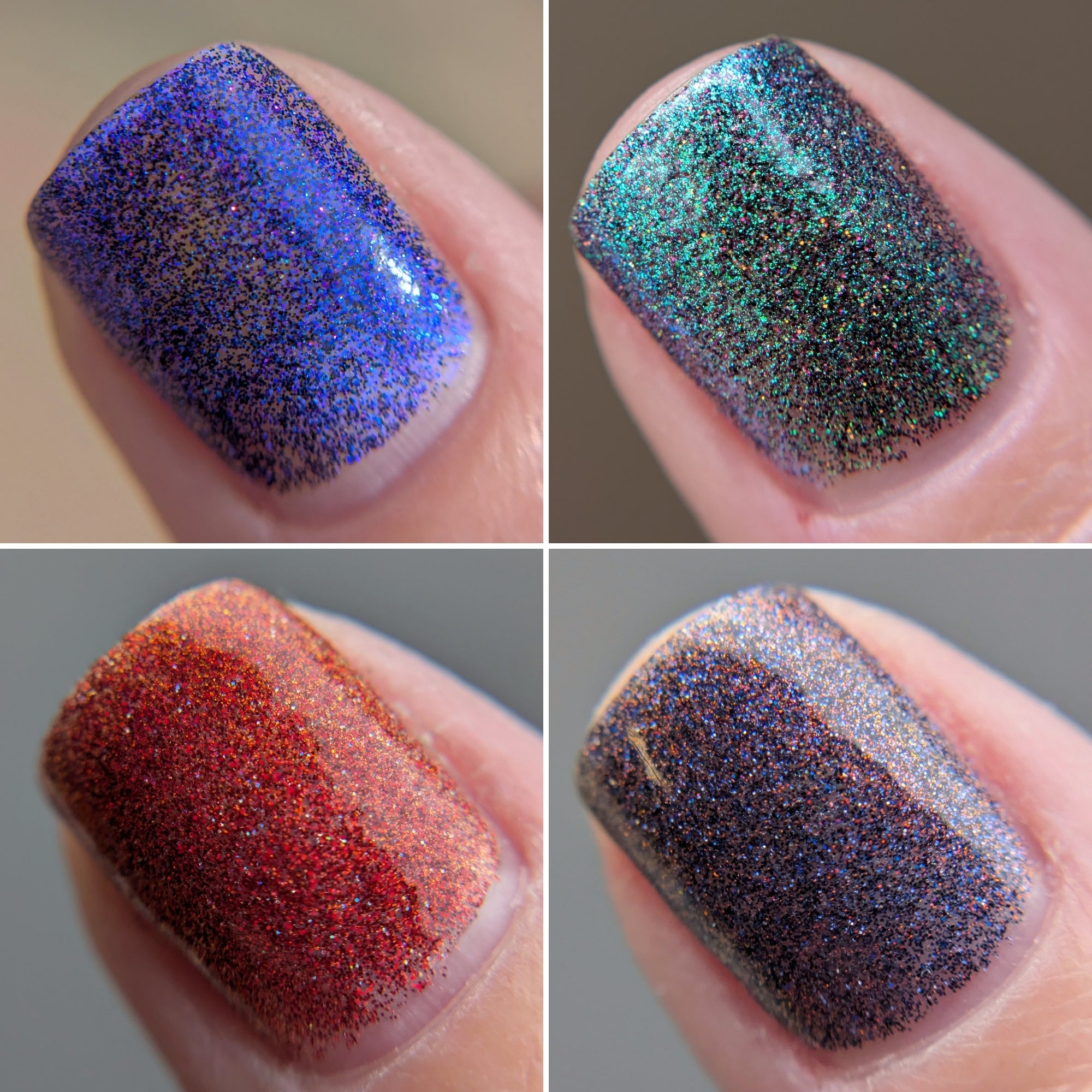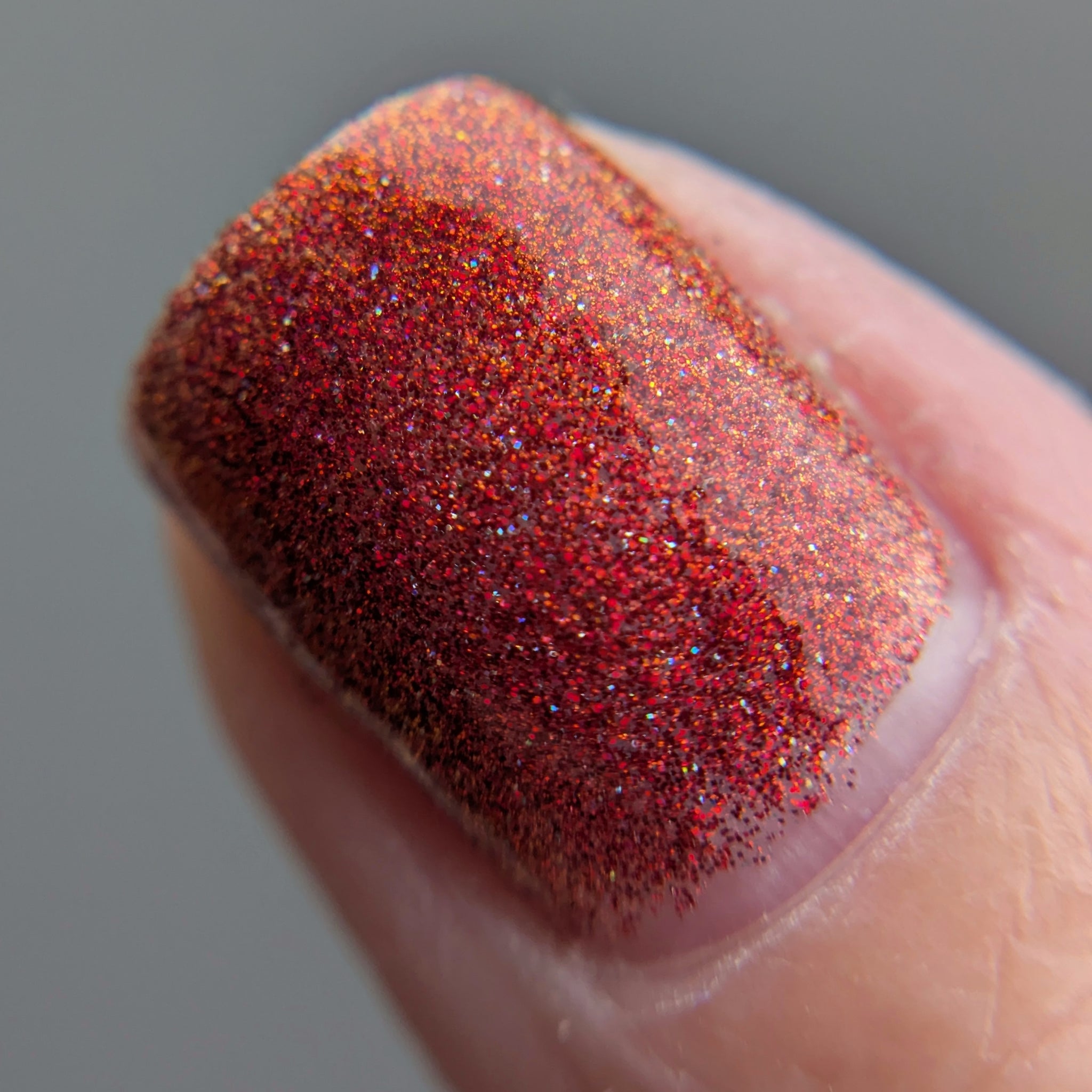 All I Want for Christmas: A clear base with red-orange shifting shimmer and red and burgundy metallic and holographic microglitter.