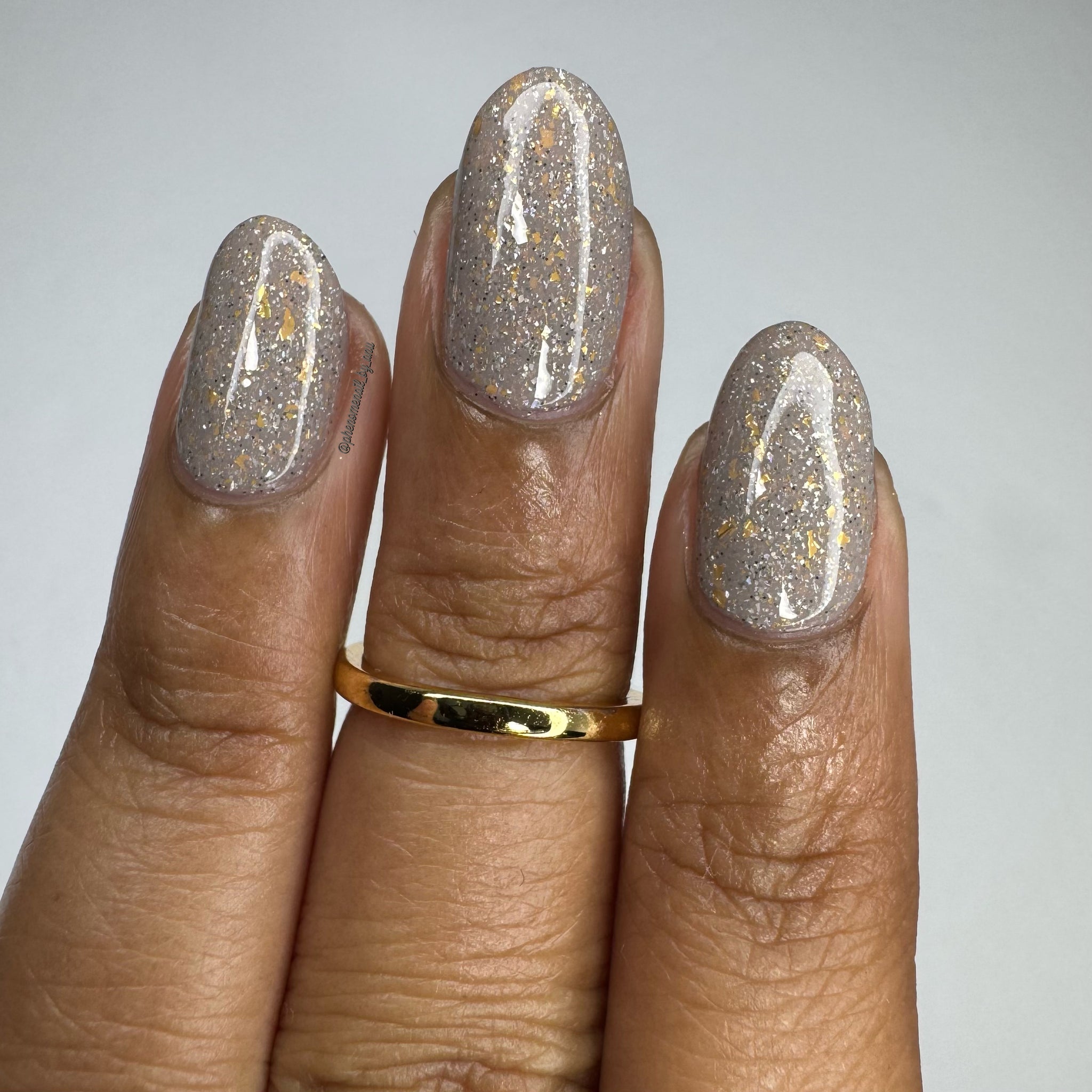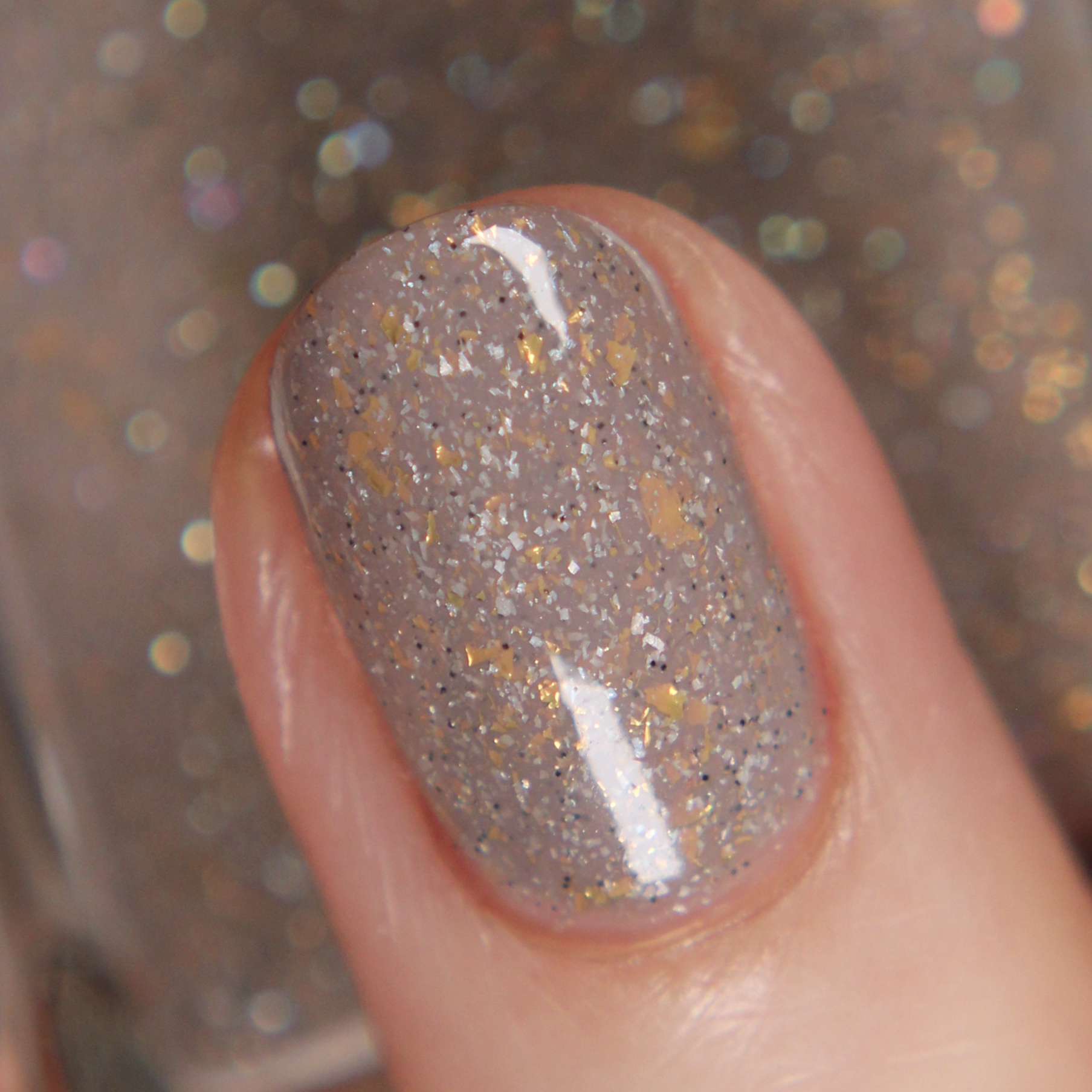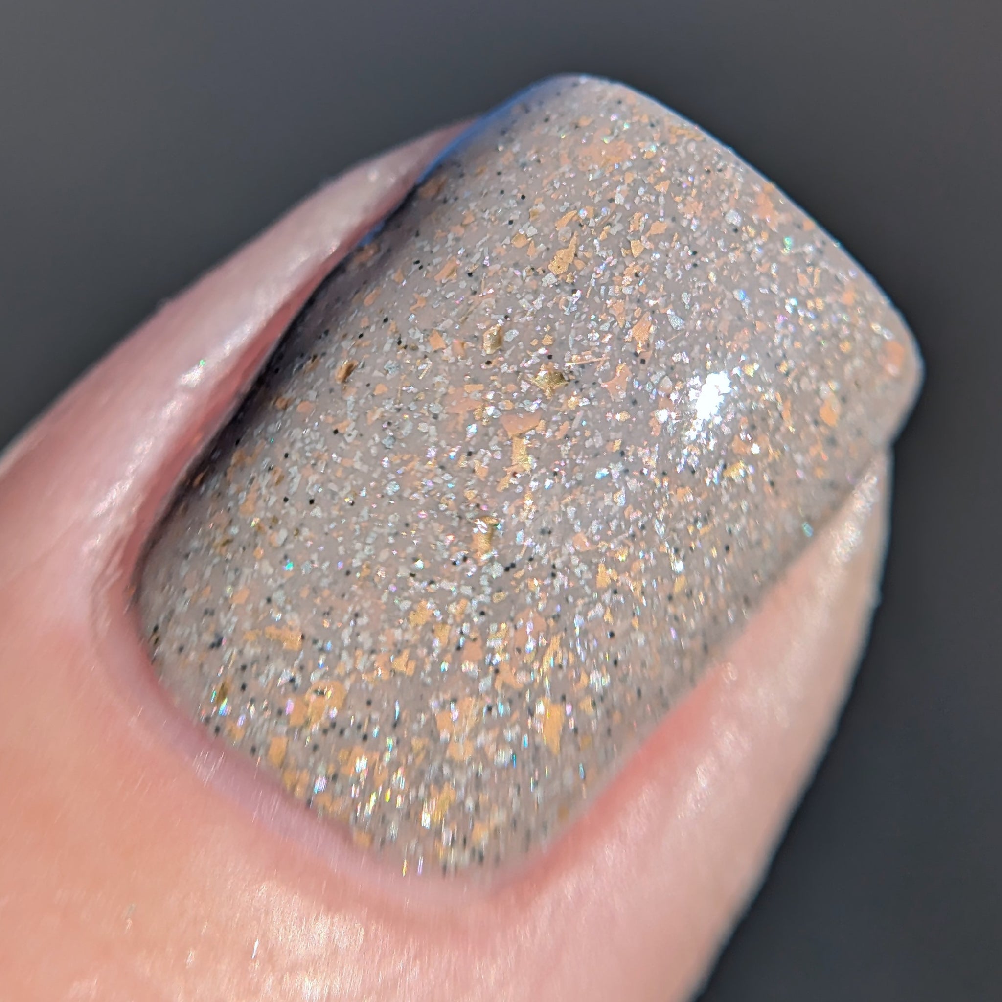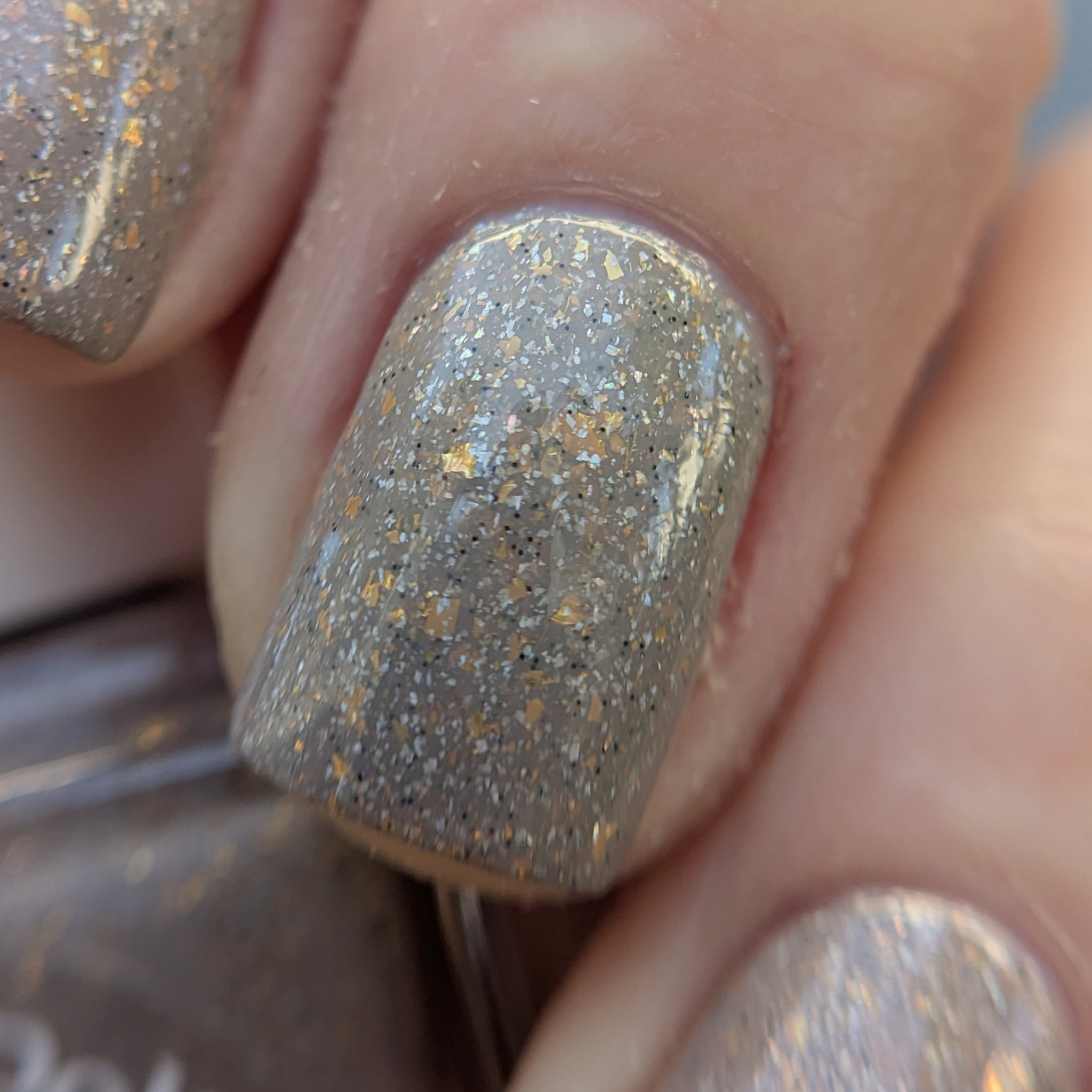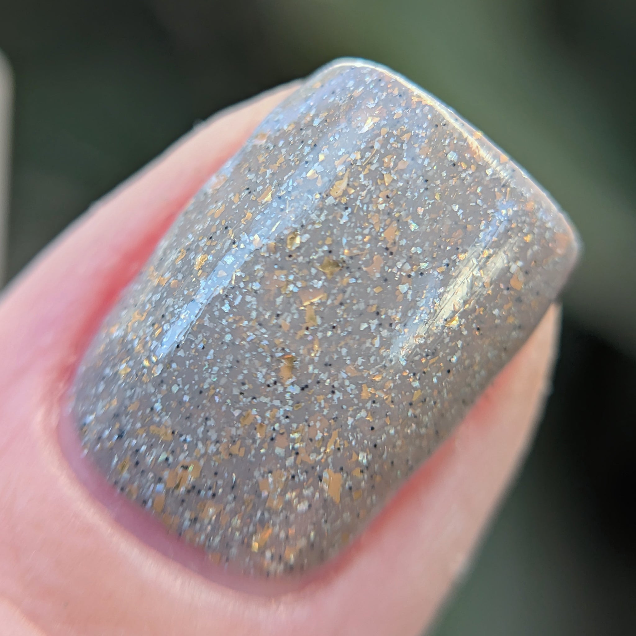 A cool taupe crelly base with gold metallic flakes, scattered holographic microflakes, and tiny black glitter.
