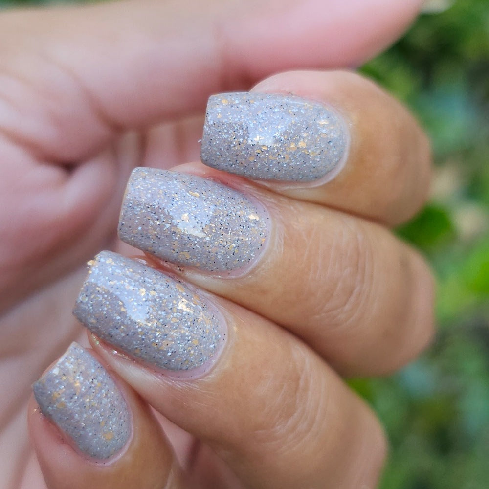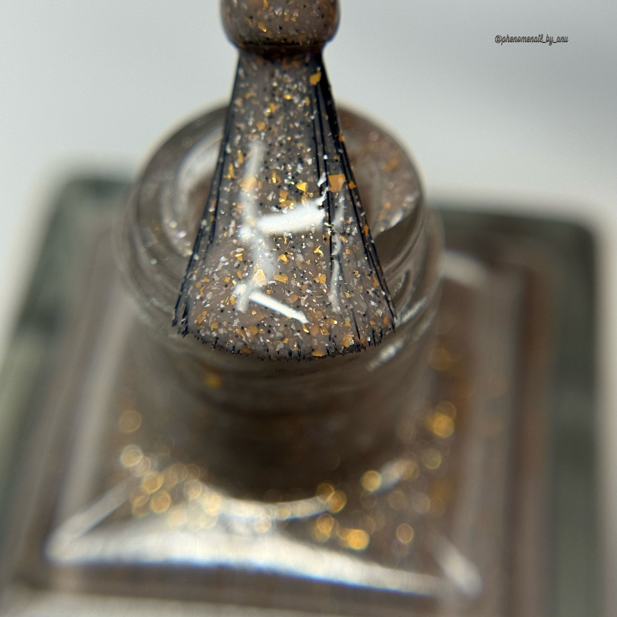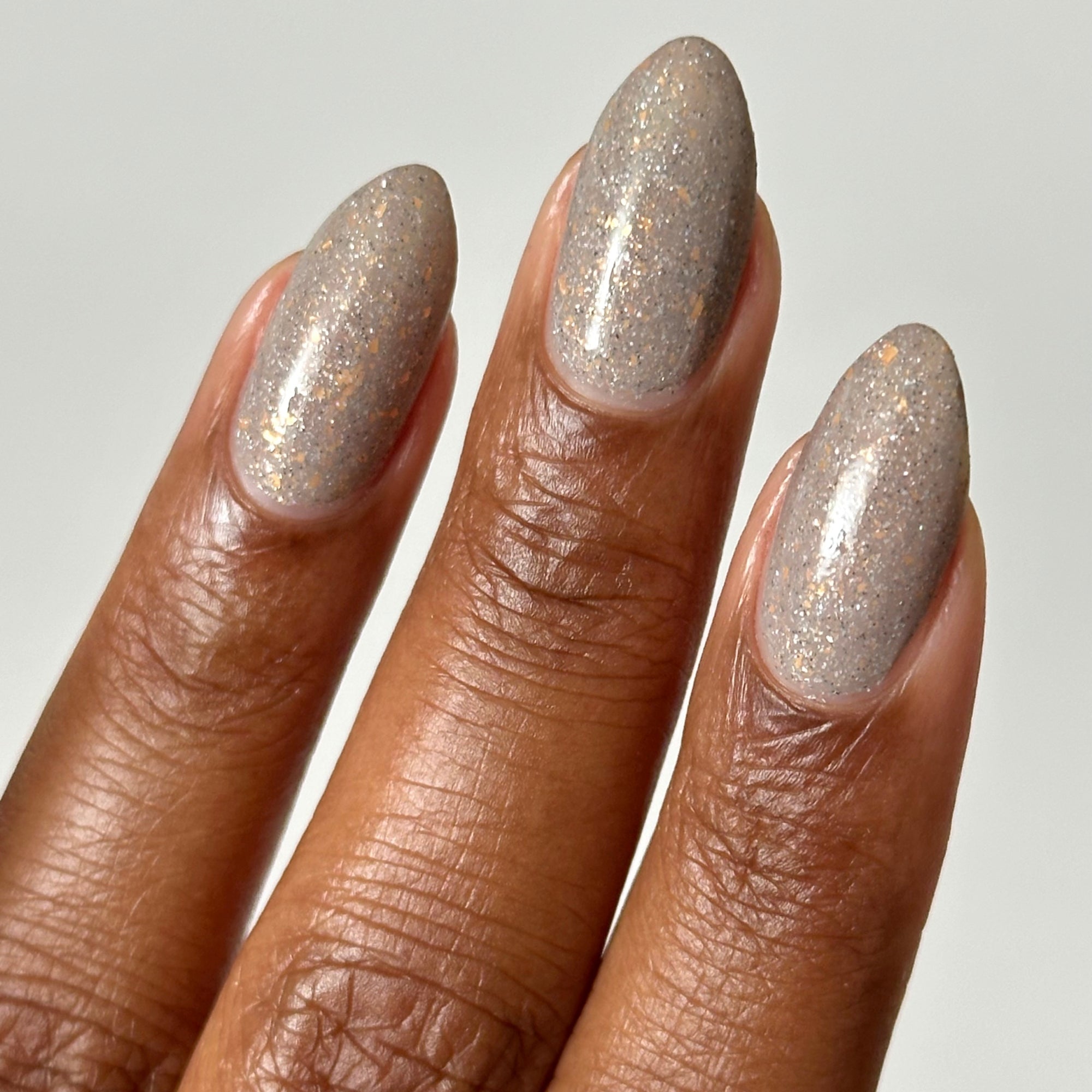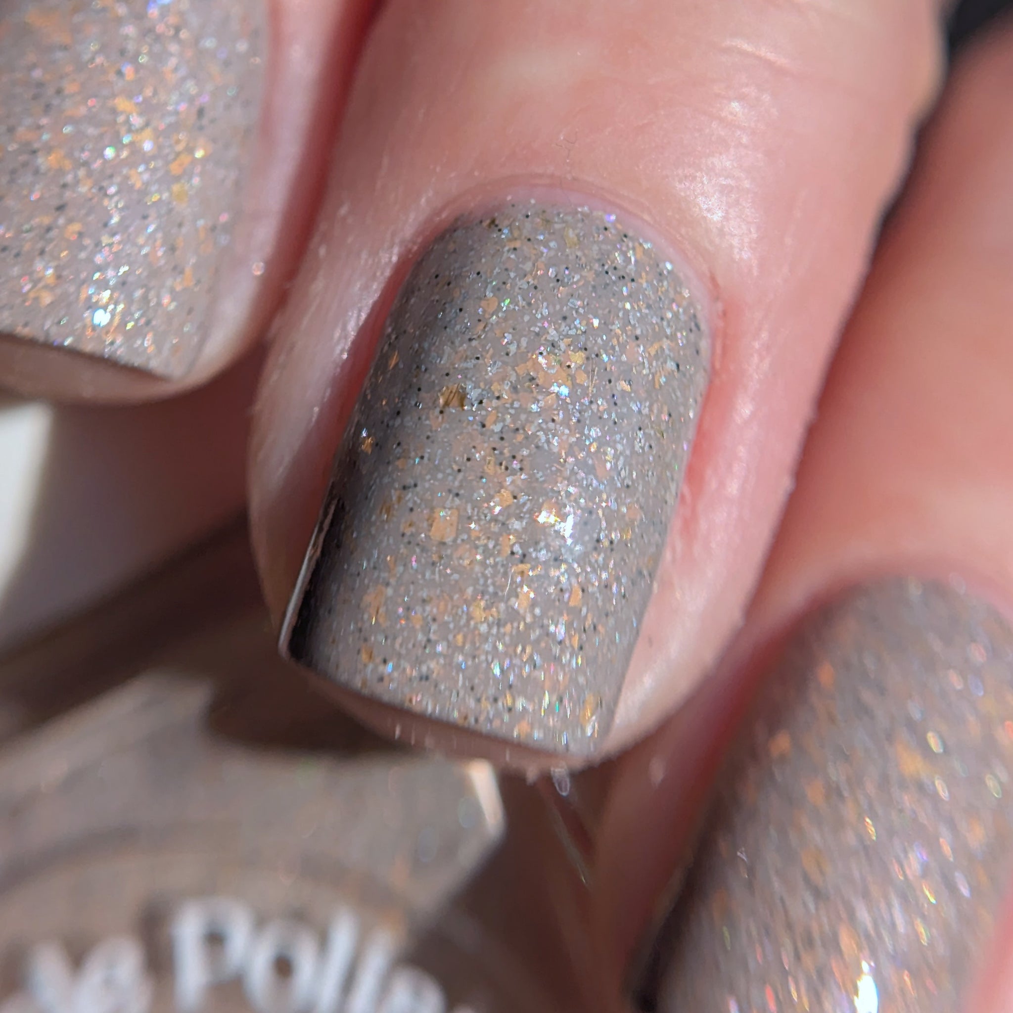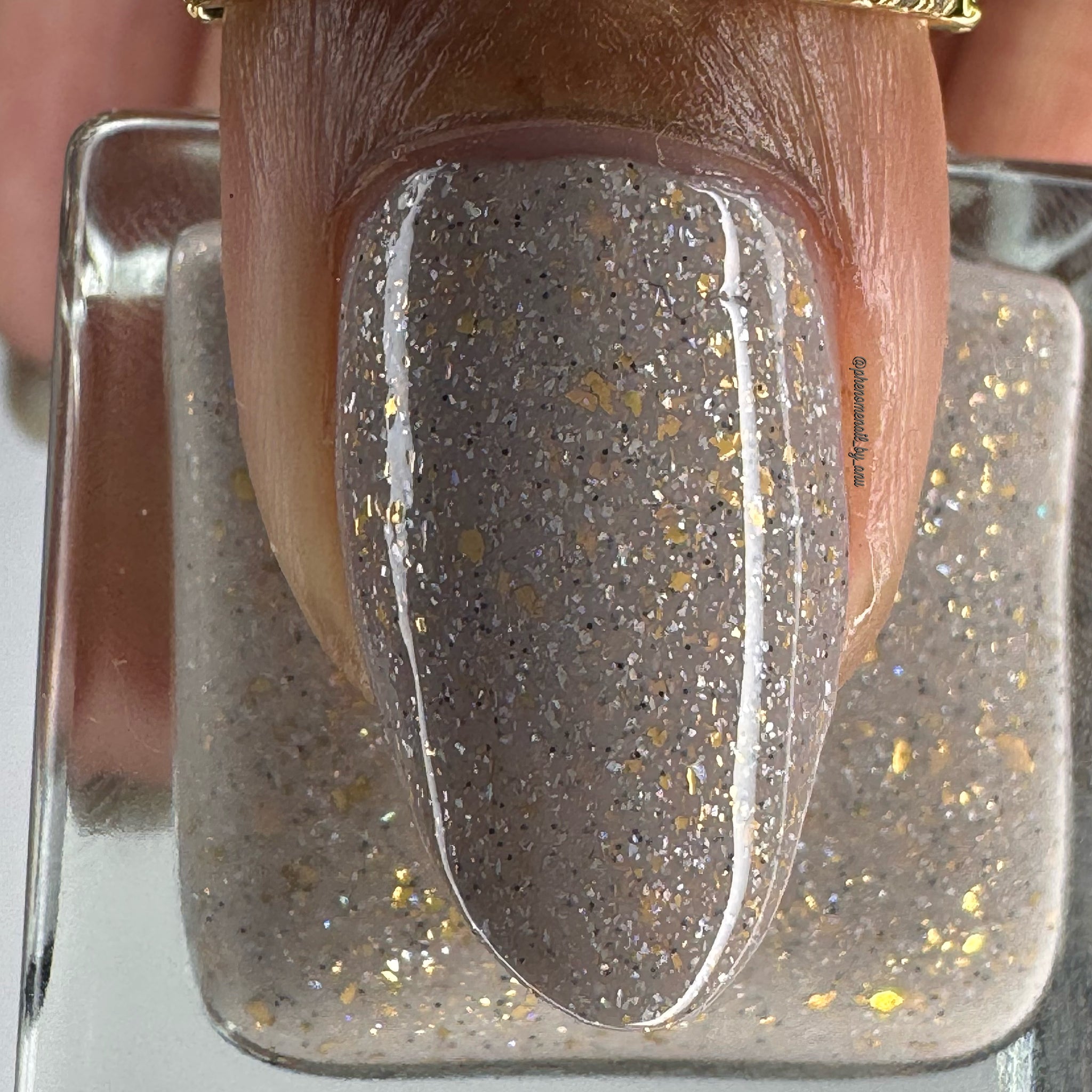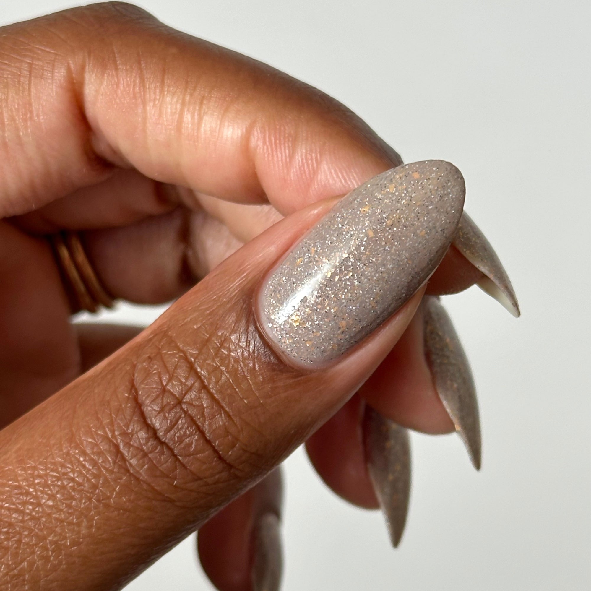 A cool taupe crelly base with gold metallic flakes, scattered holographic microflakes, and tiny black glitter.