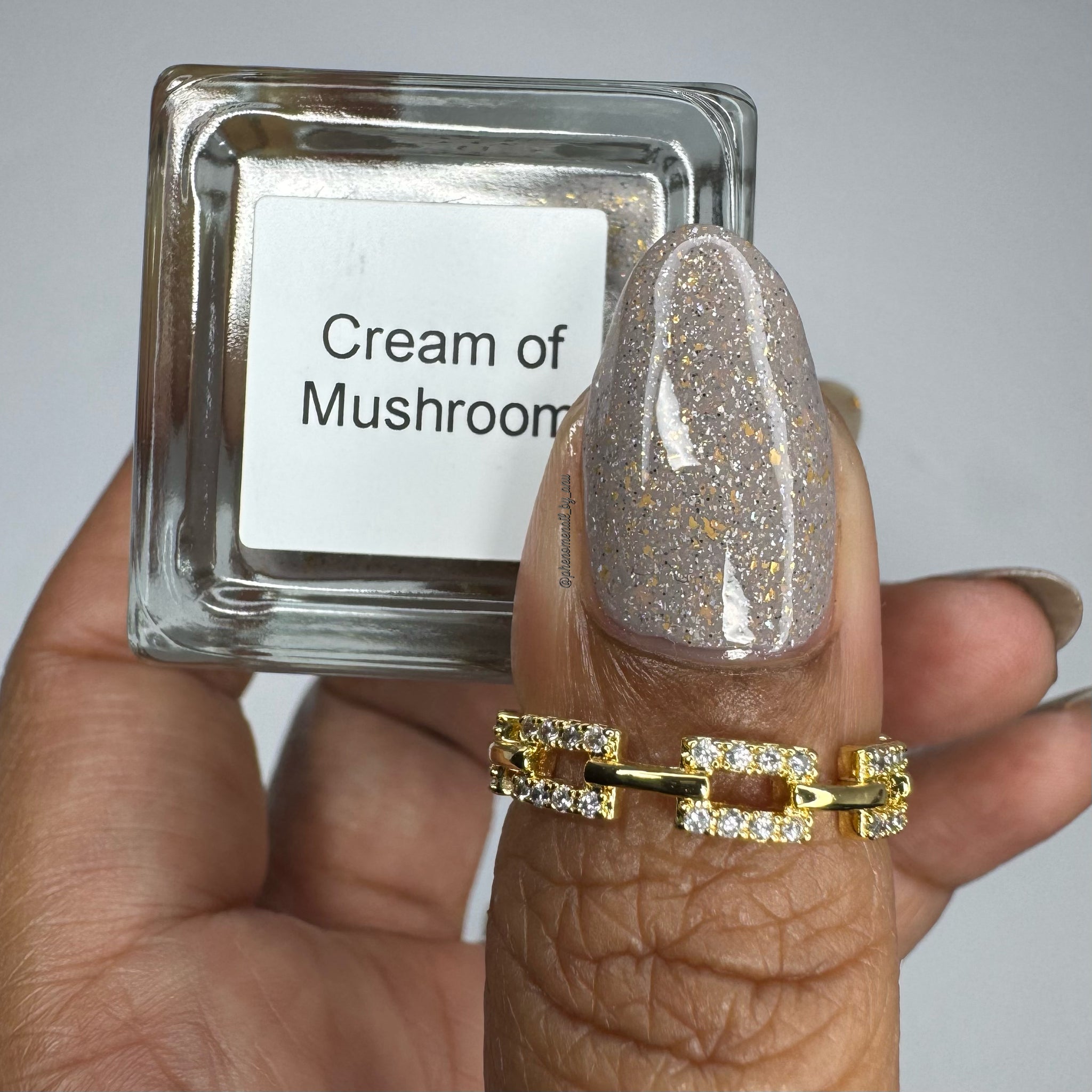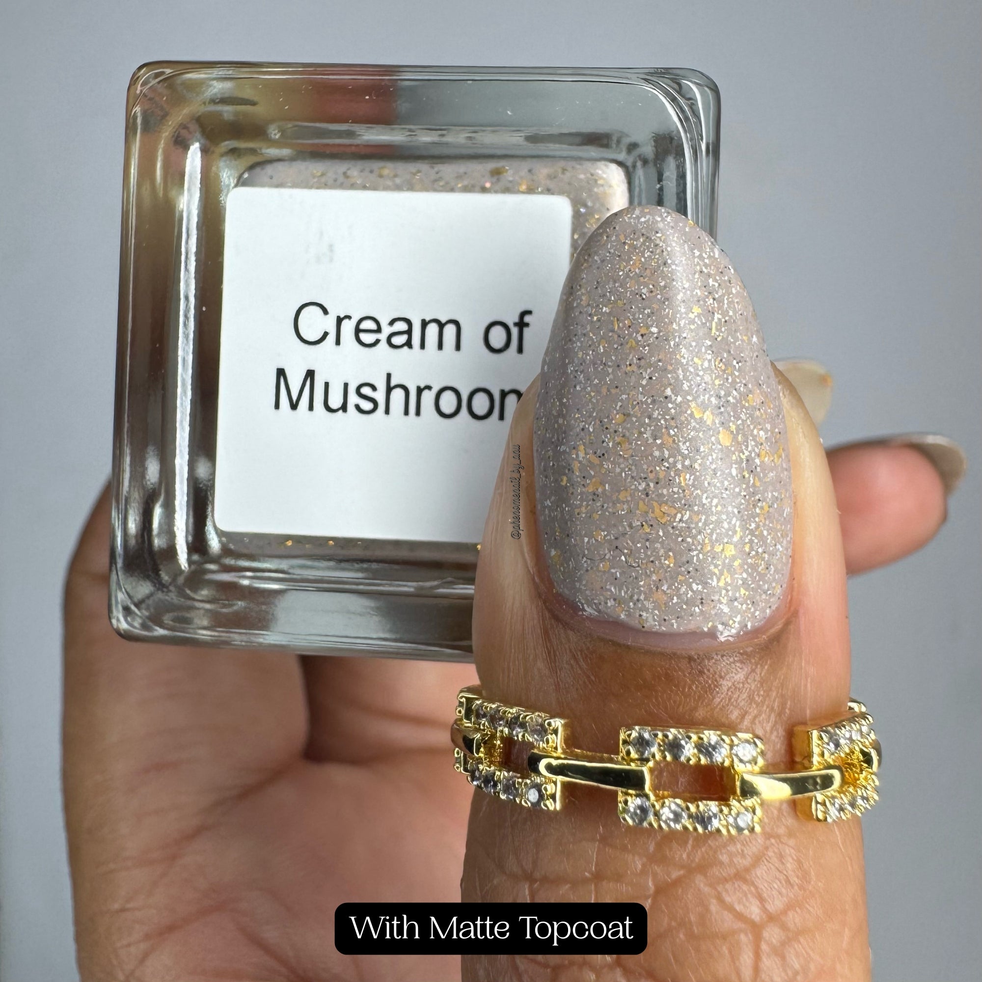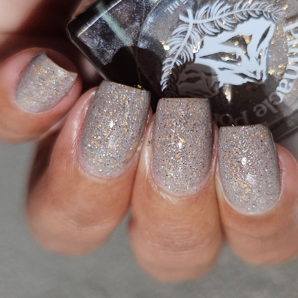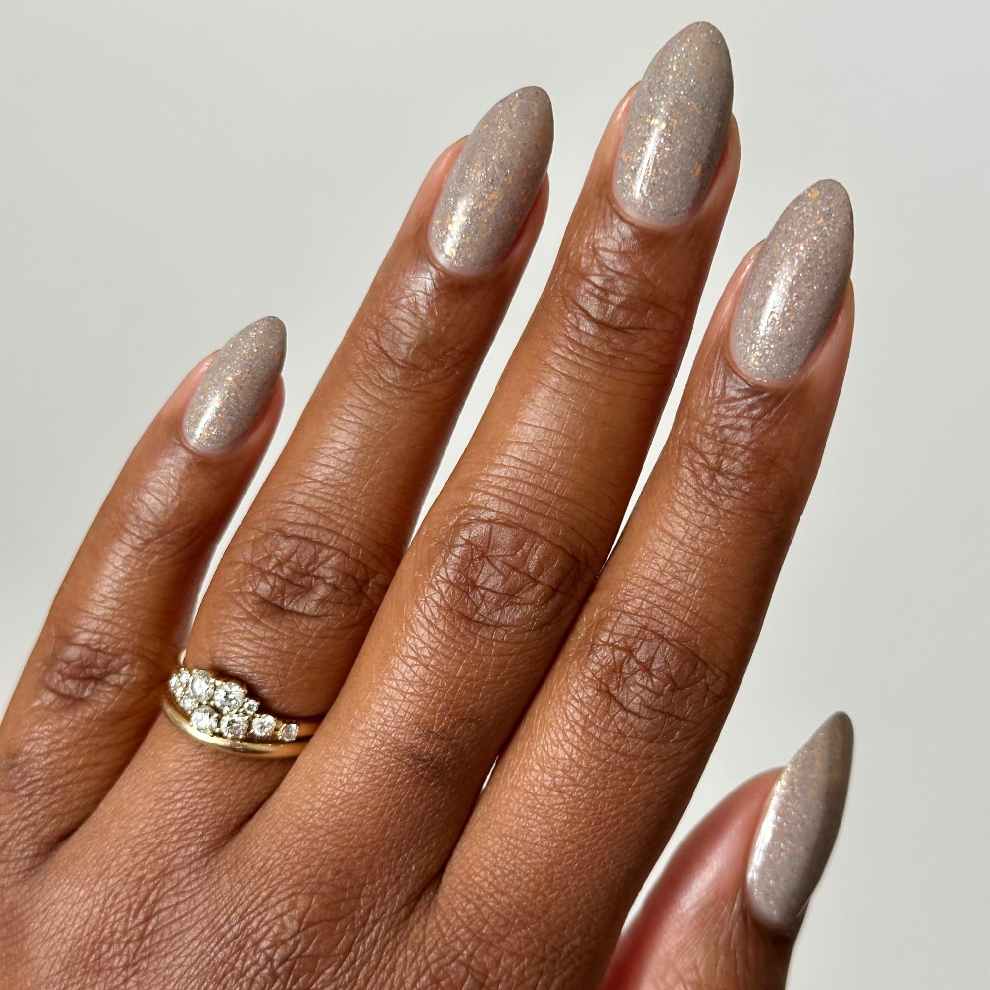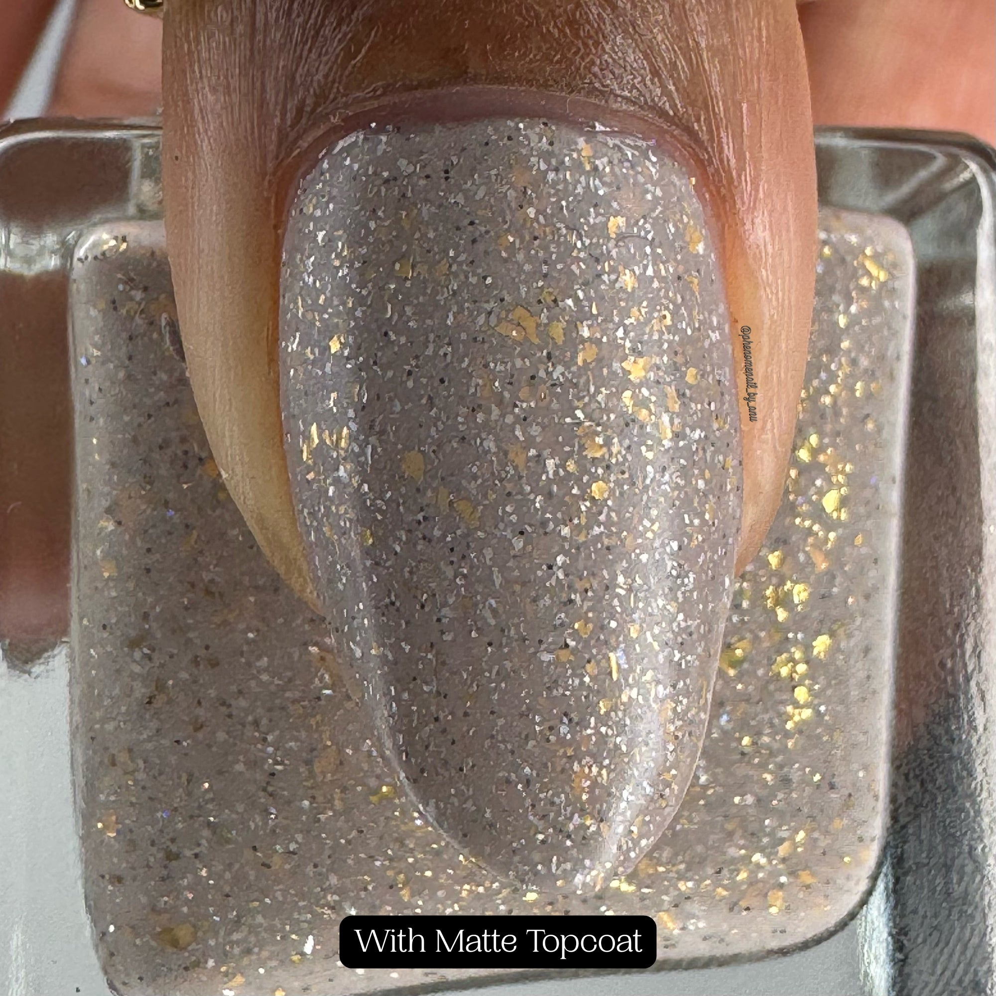 A cool taupe crelly base with gold metallic flakes, scattered holographic microflakes, and tiny black glitter.