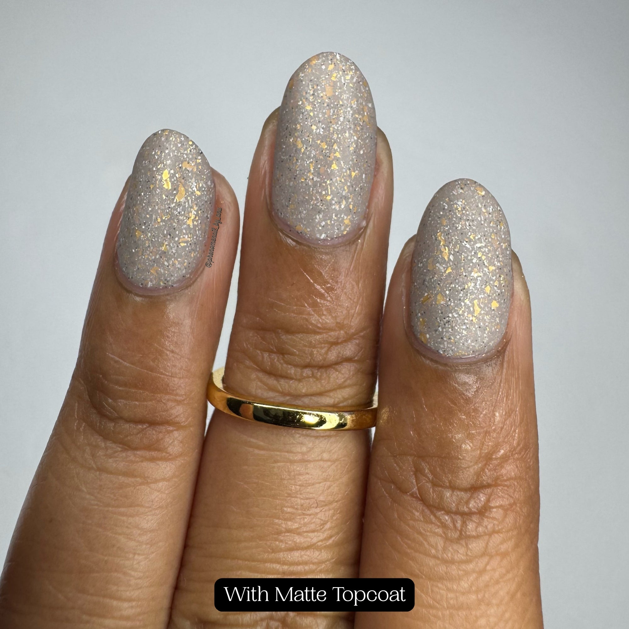 In order to let the contrast between the gold metallic and silver holo flakes show, the bases on these are more sheer than some of my other similar polishes. You may prefer 3 coats for fuller coverage. While the flakes in this polish are very thin and lie flat on the nail, the polish dries a bit dull without topcoat.