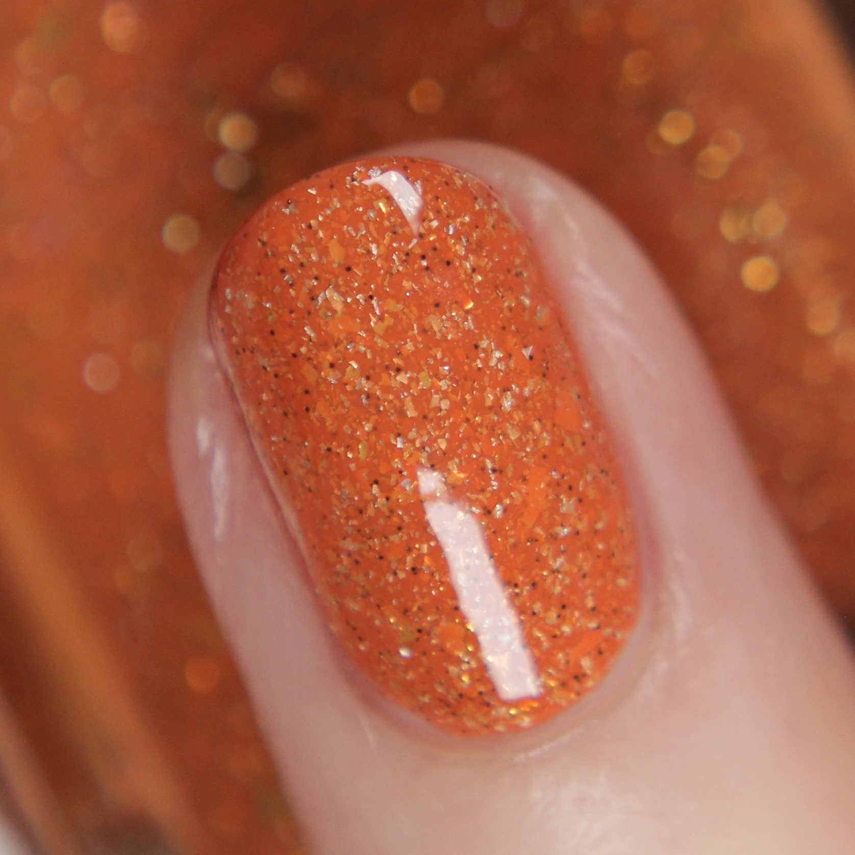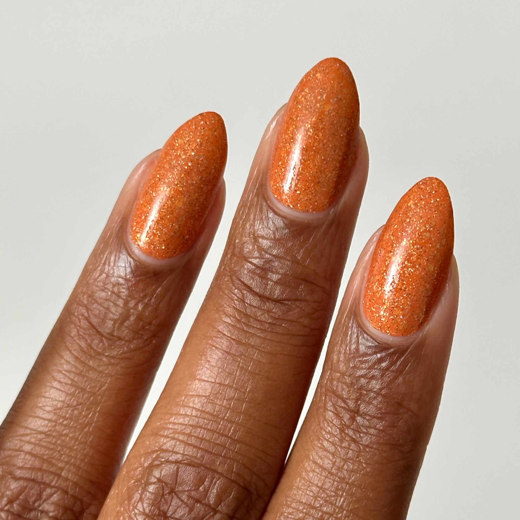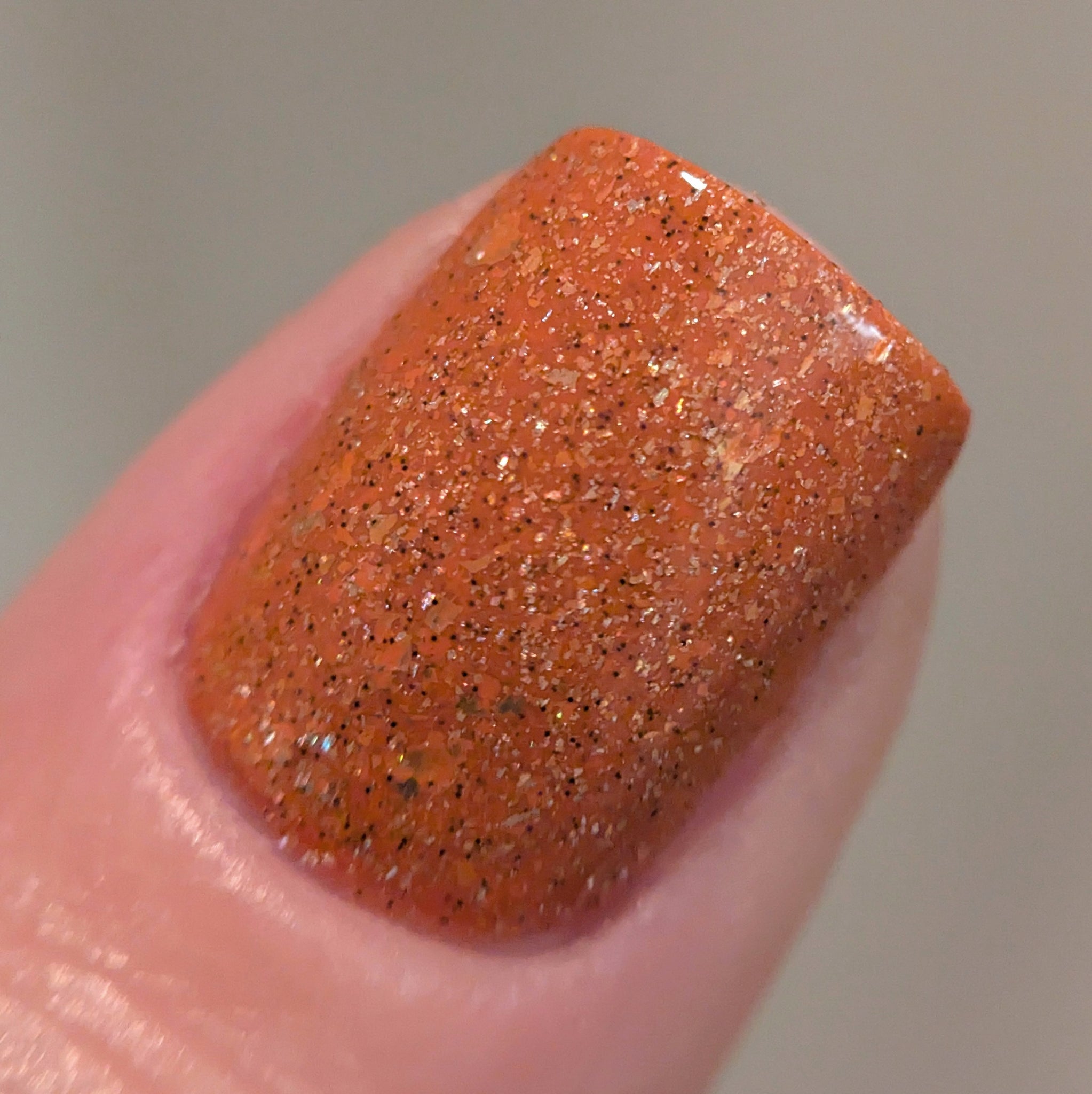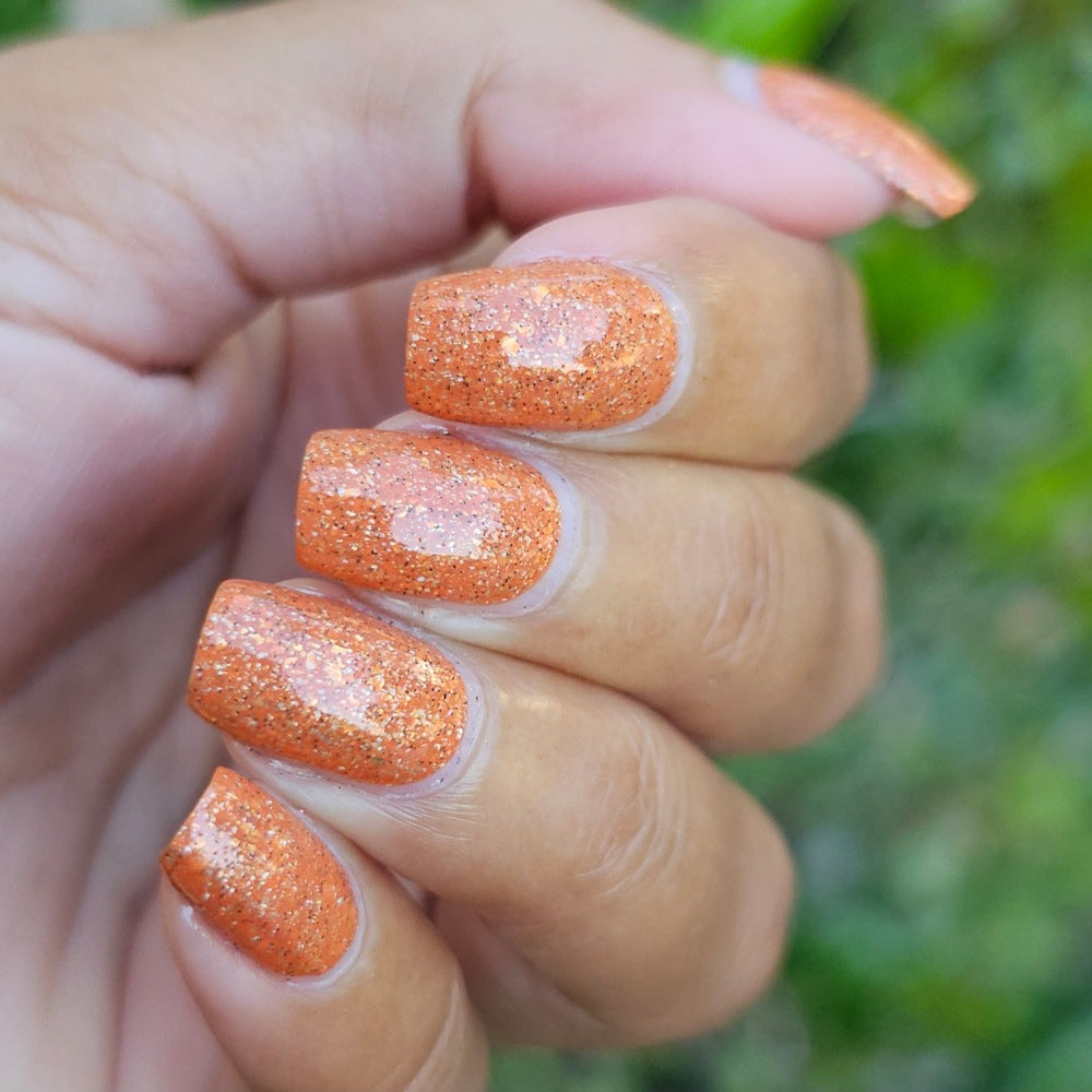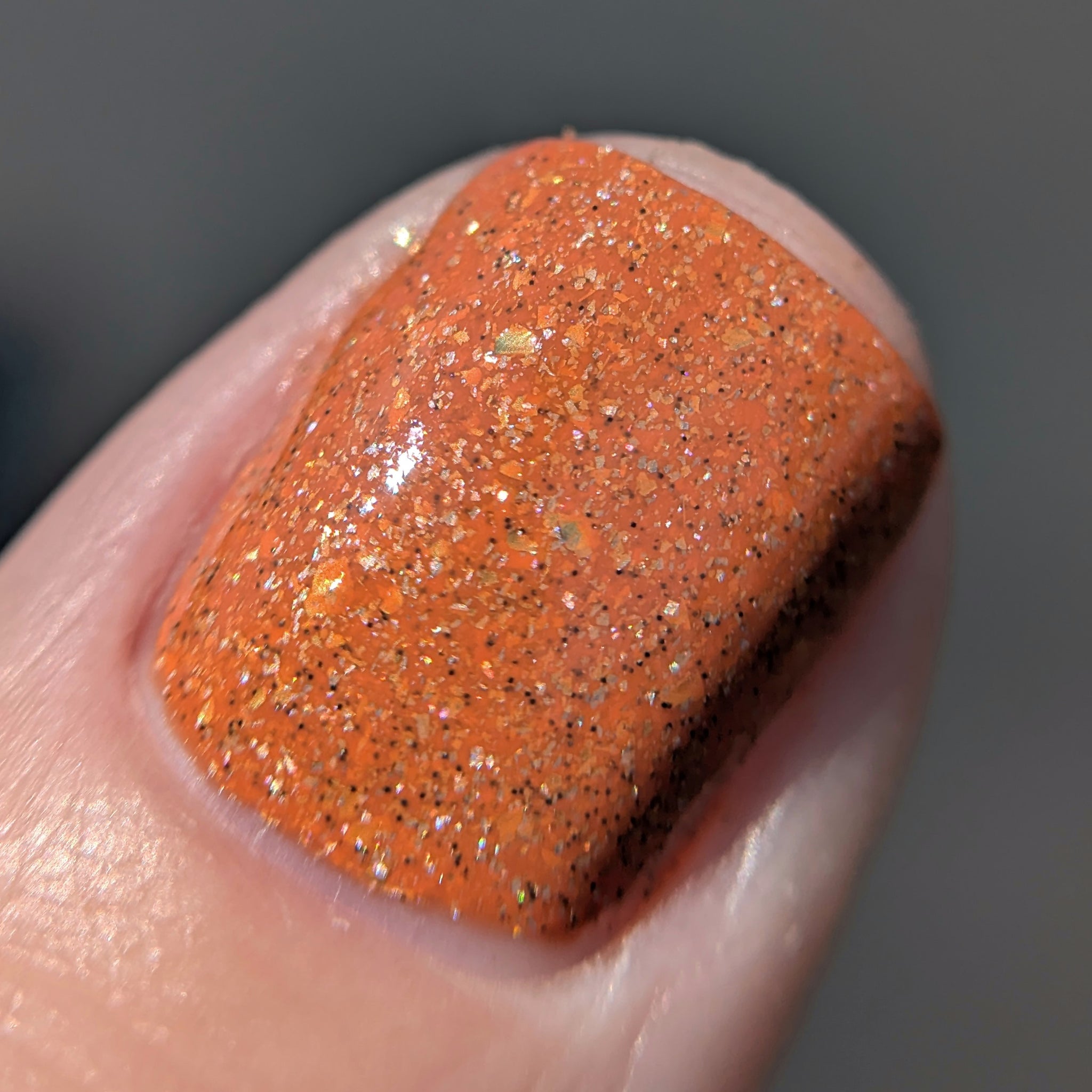A warm orange crelly base with gold metallic flakes, scattered holographic microflakes, and tiny black glitter.