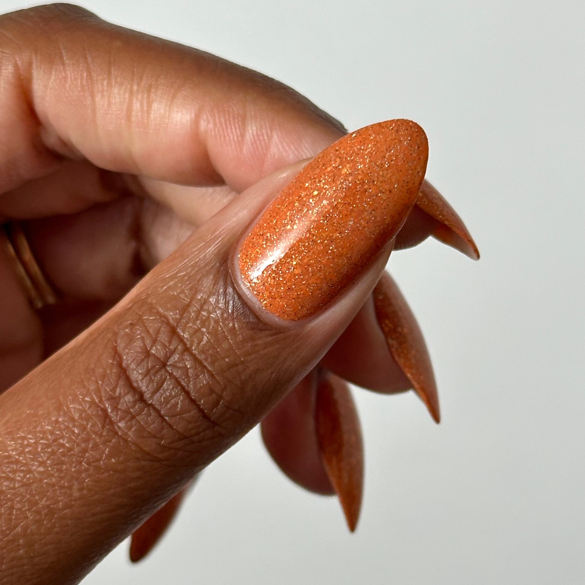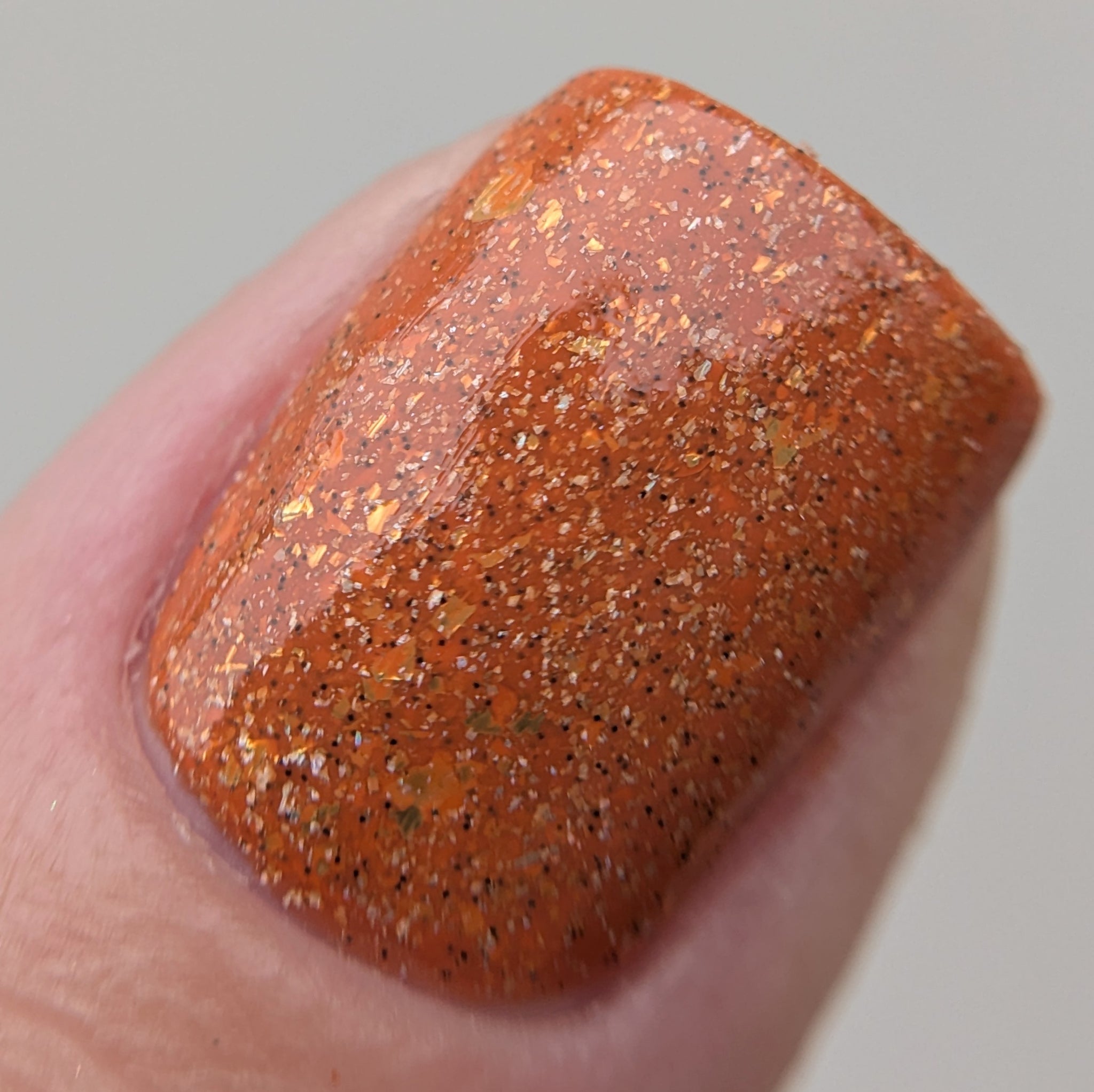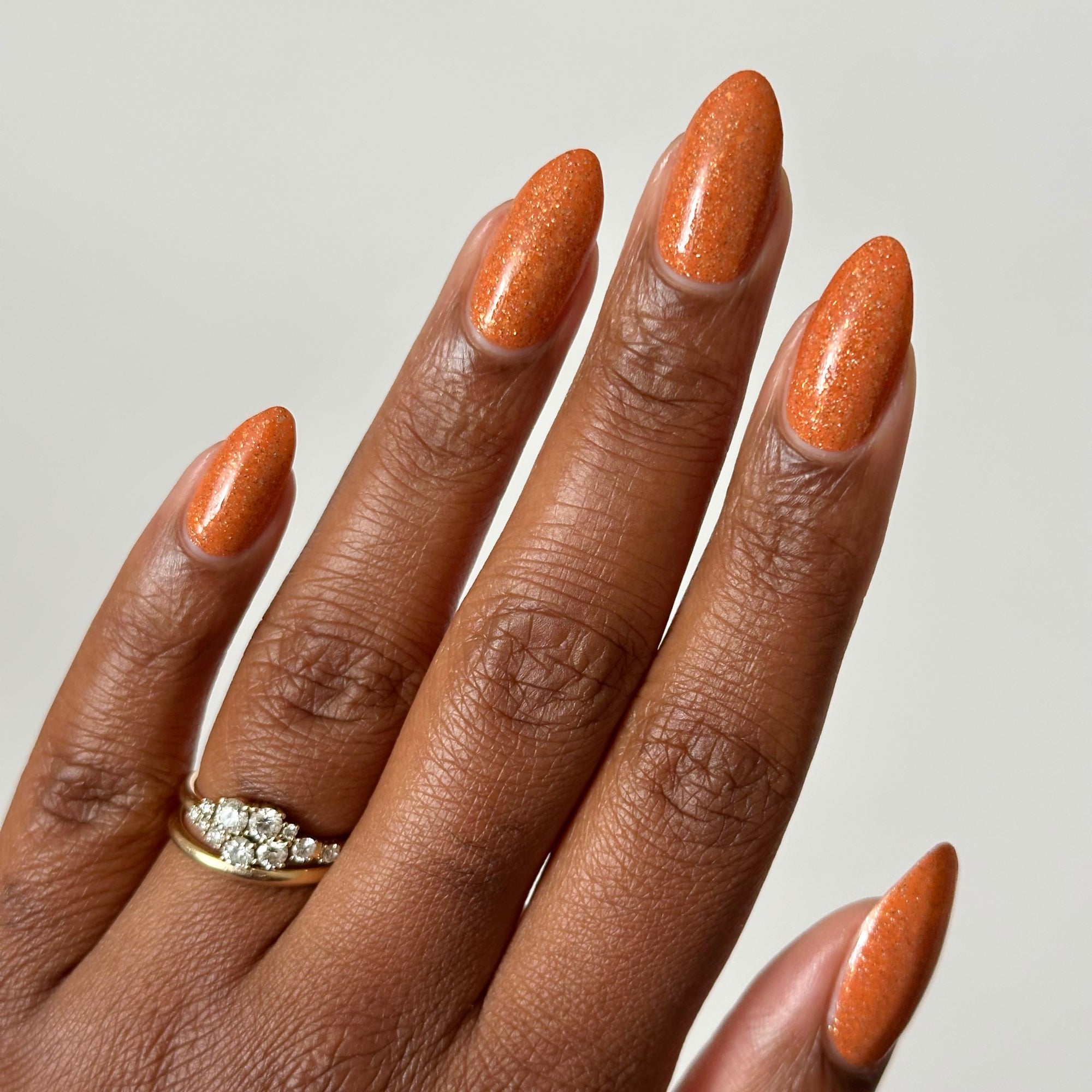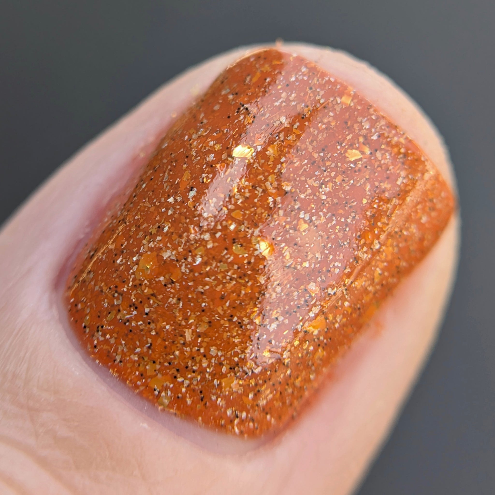 A warm orange crelly base with gold metallic flakes, scattered holographic microflakes, and tiny black glitter.
