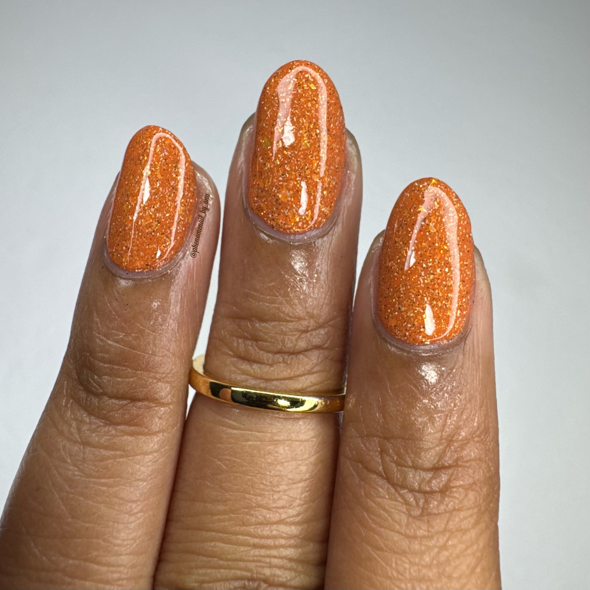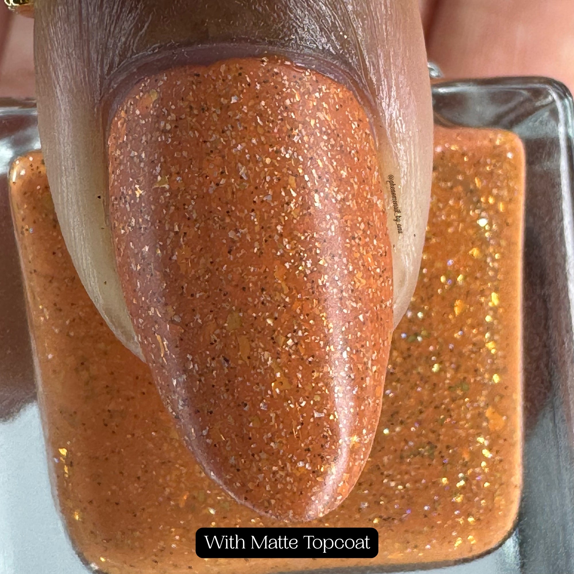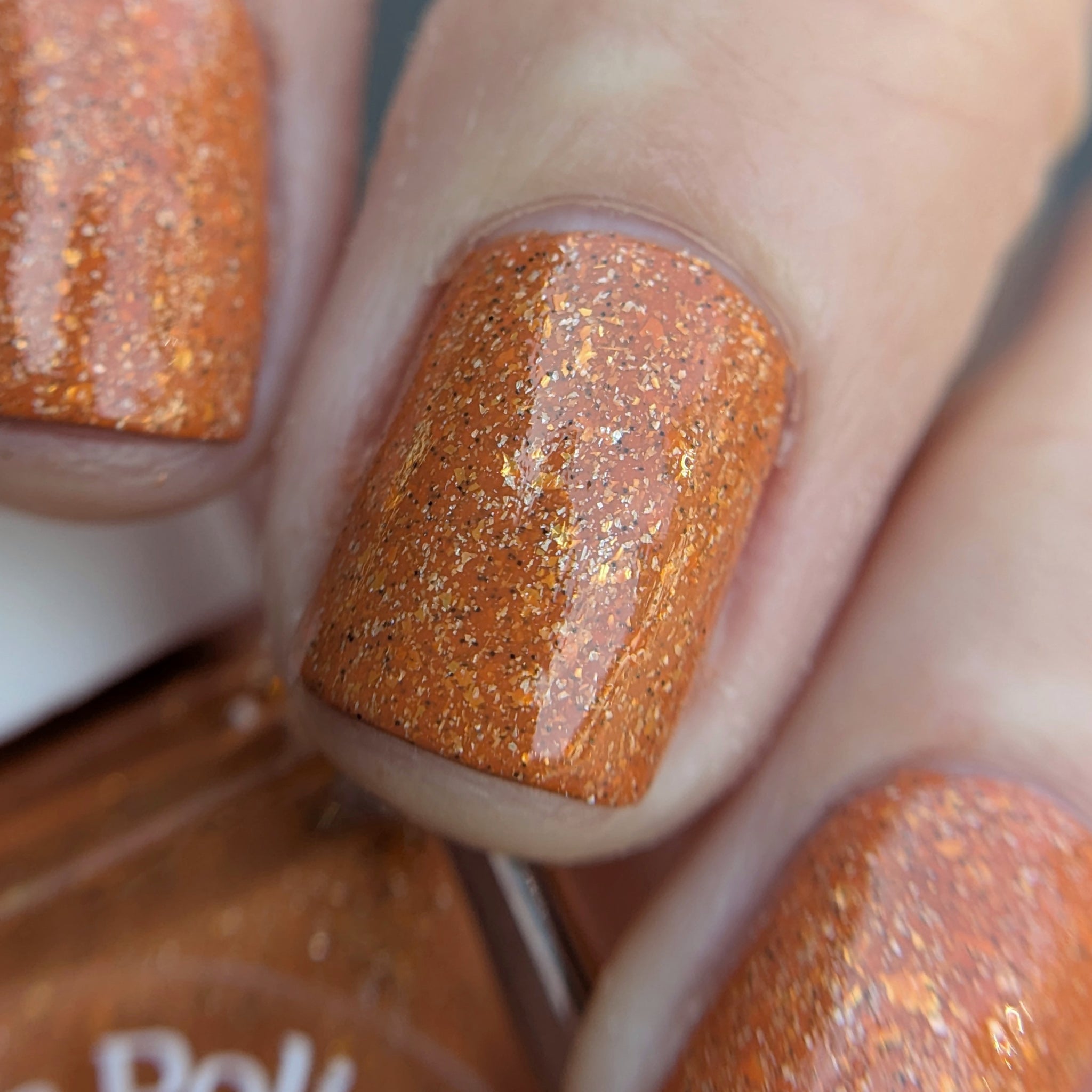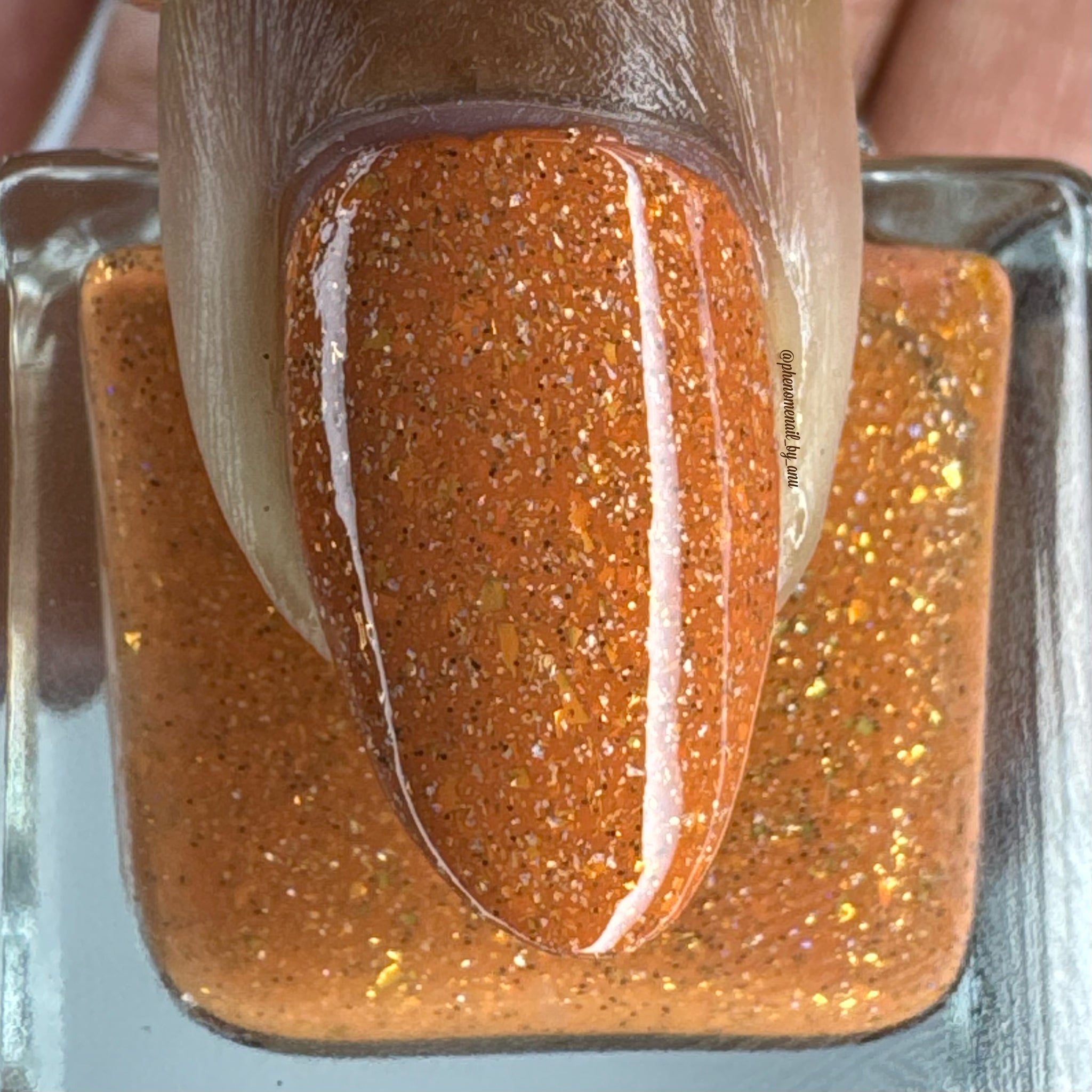 A warm orange crelly base with gold metallic flakes, scattered holographic microflakes, and tiny black glitter.