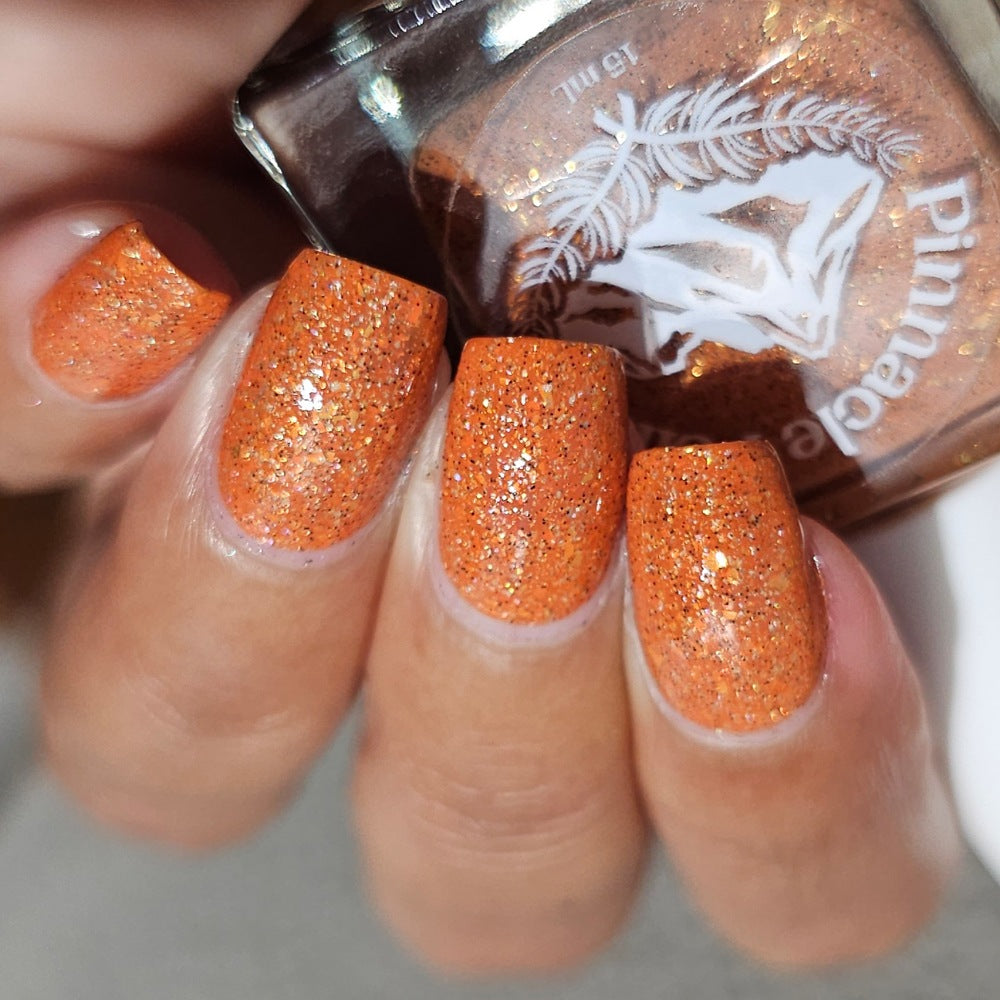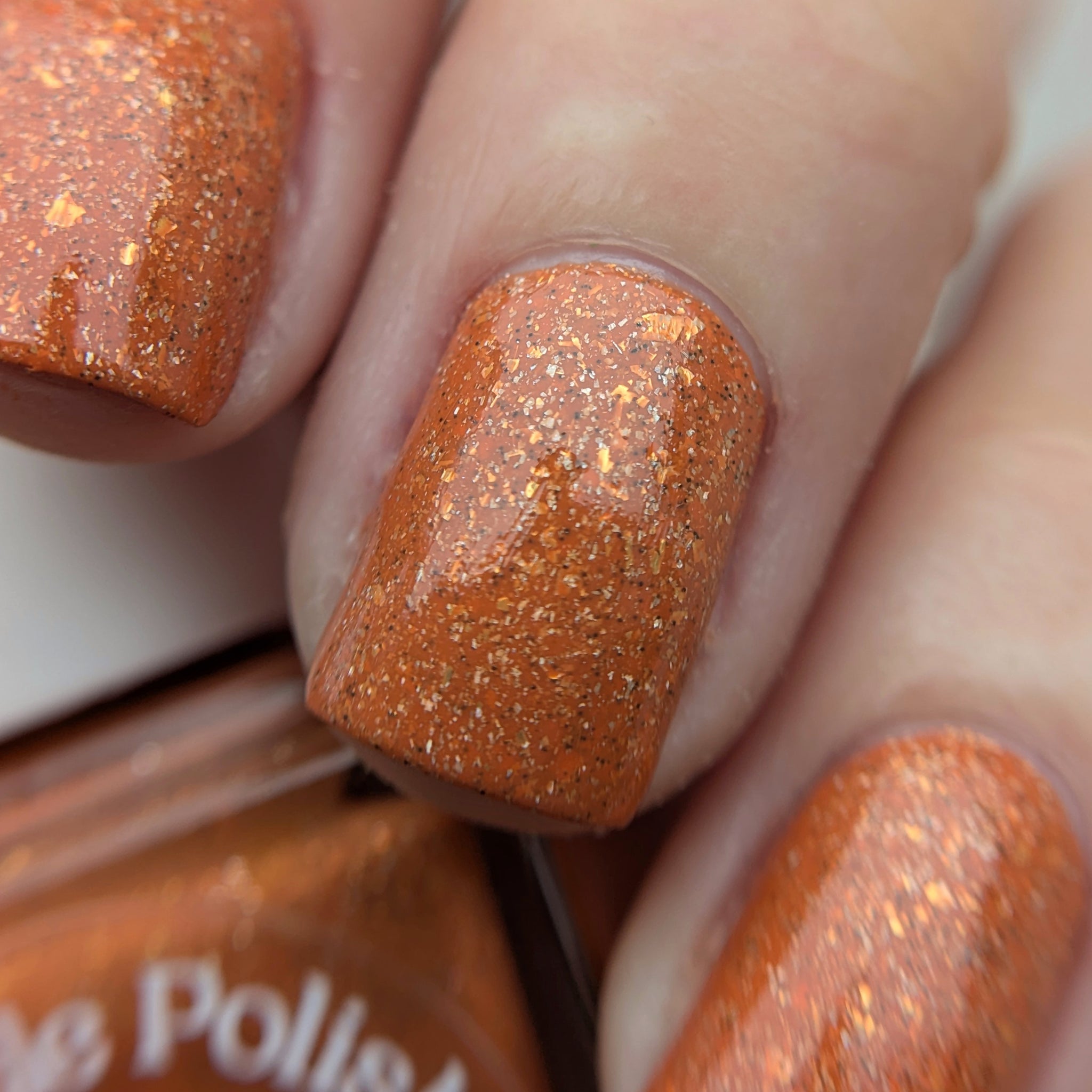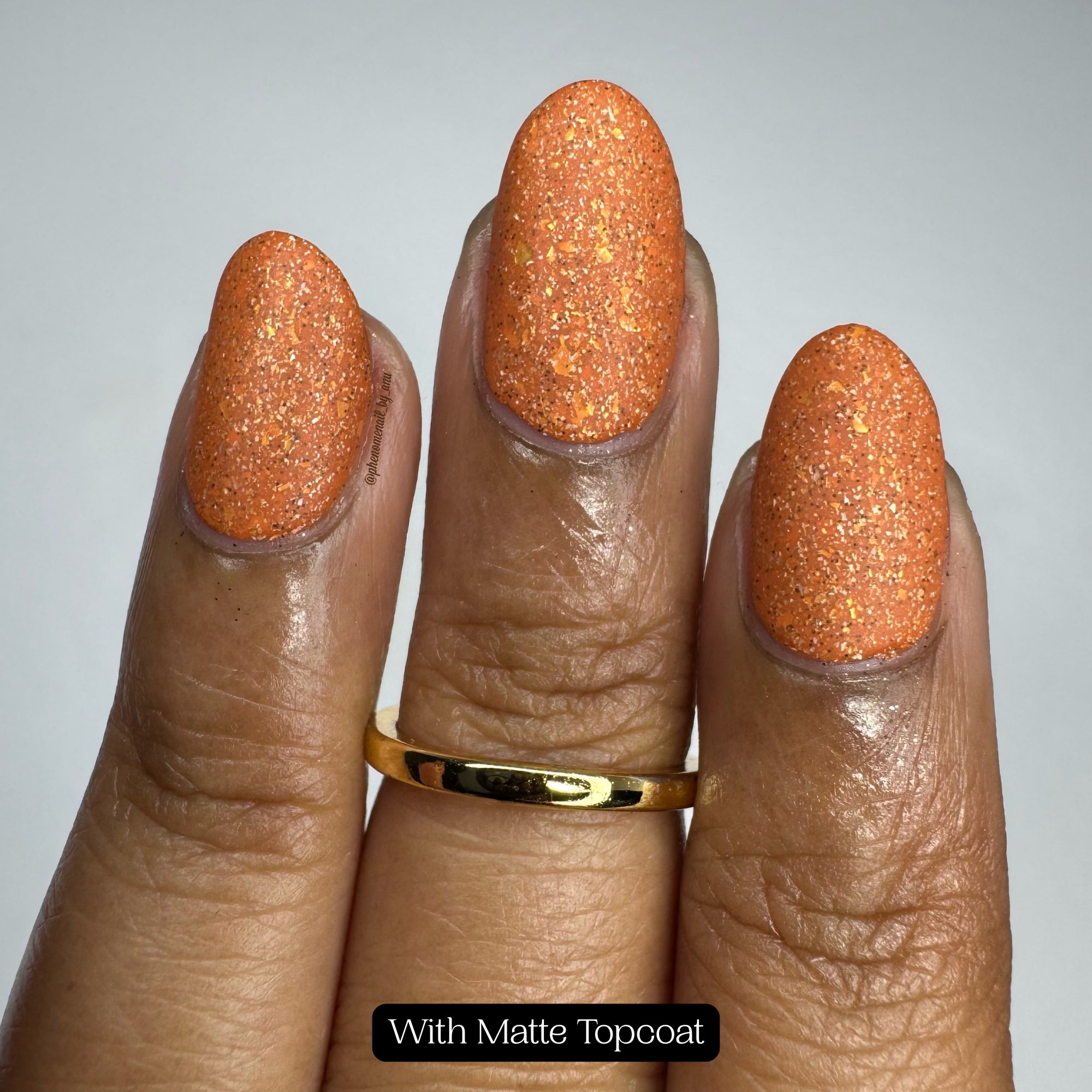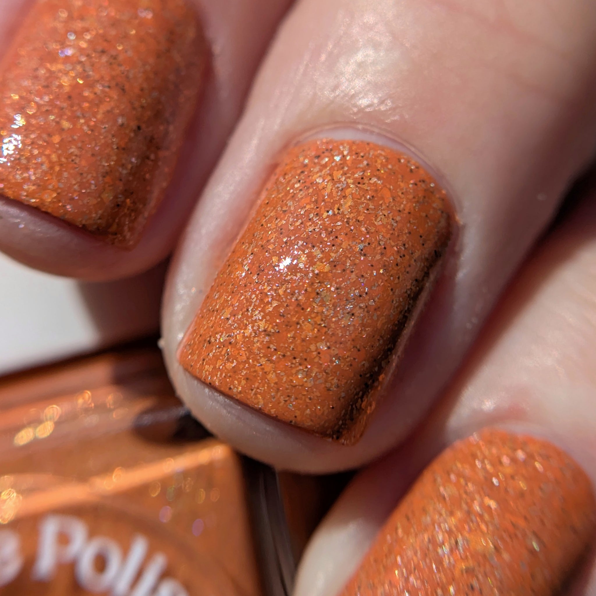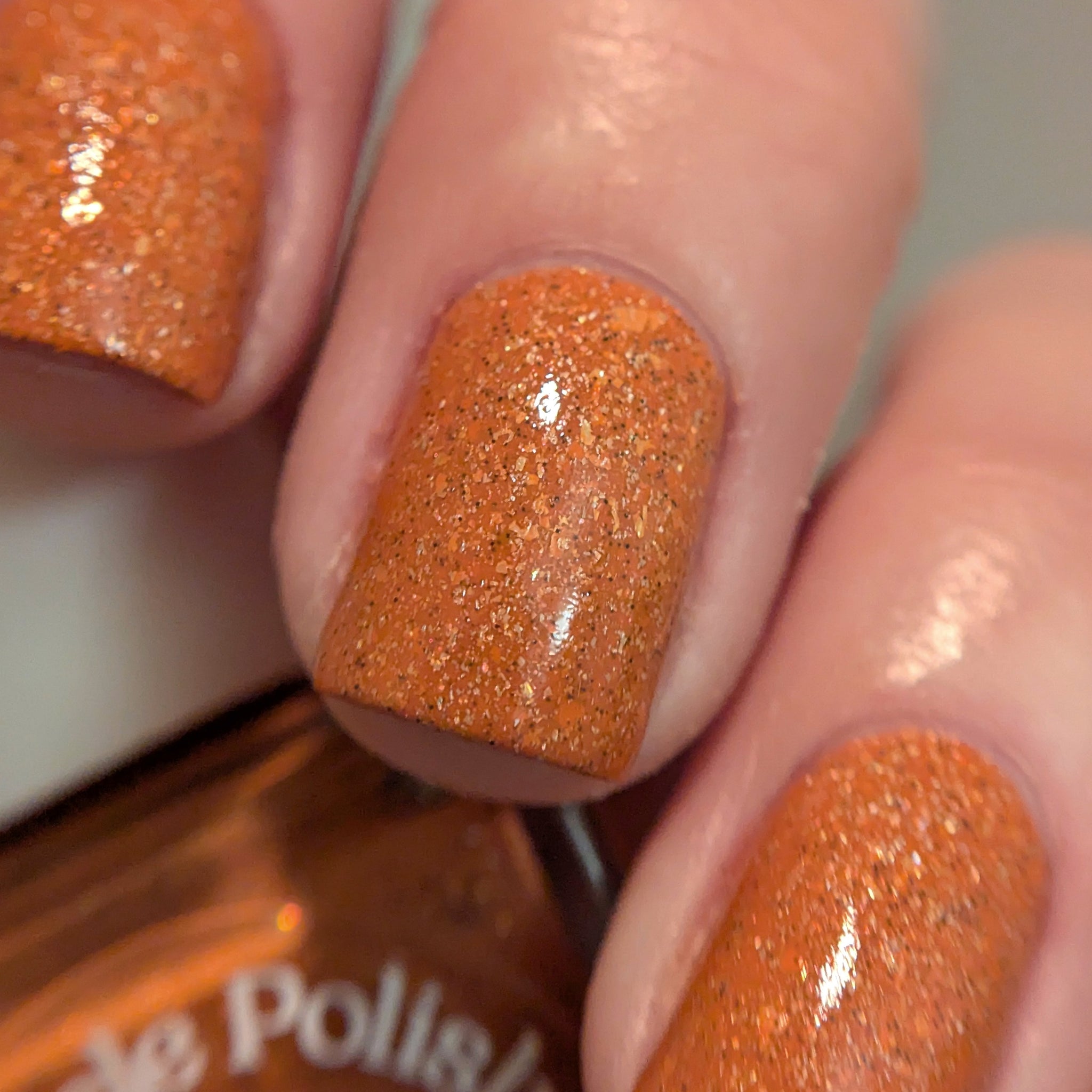 A warm orange crelly base with gold metallic flakes, scattered holographic microflakes, and tiny black glitter.