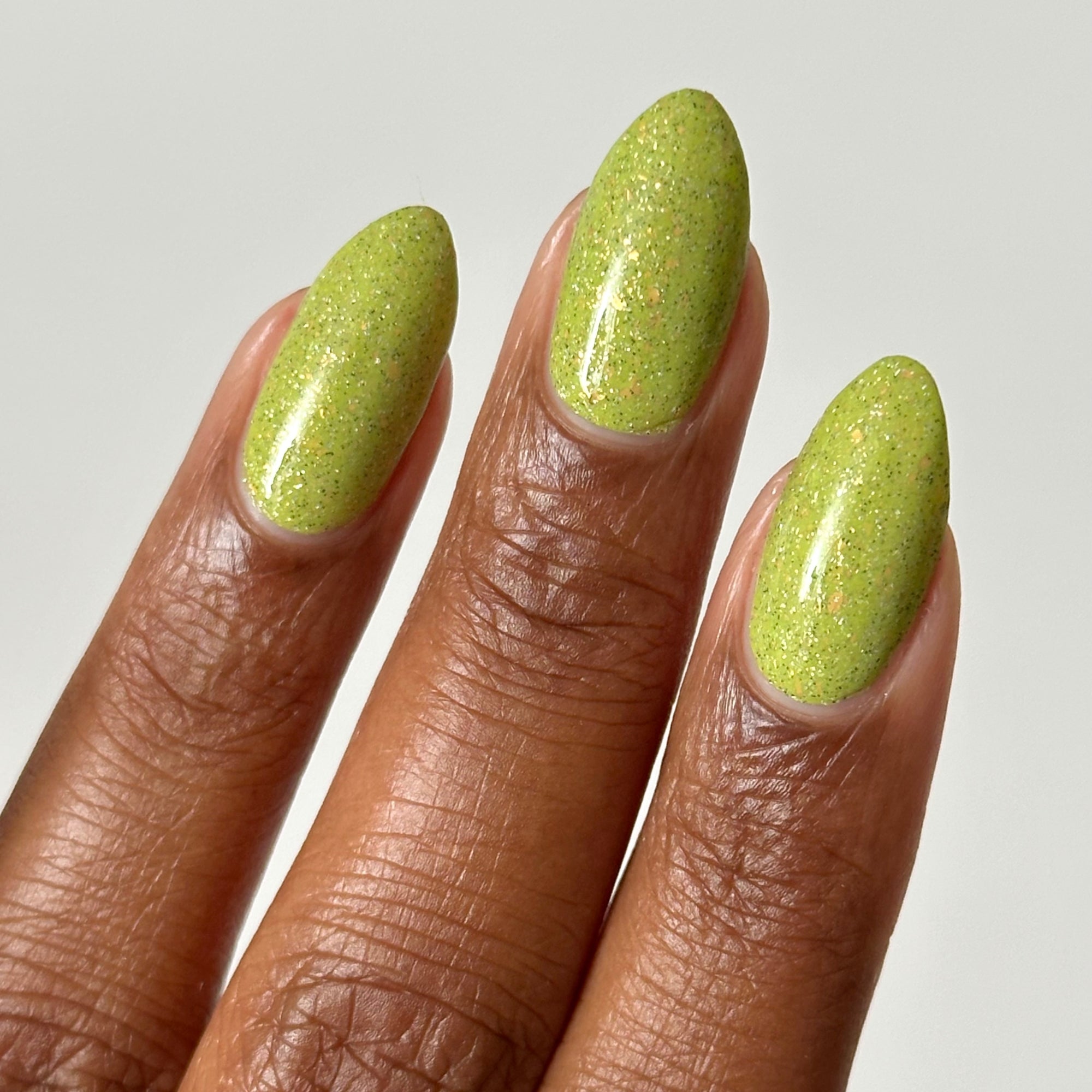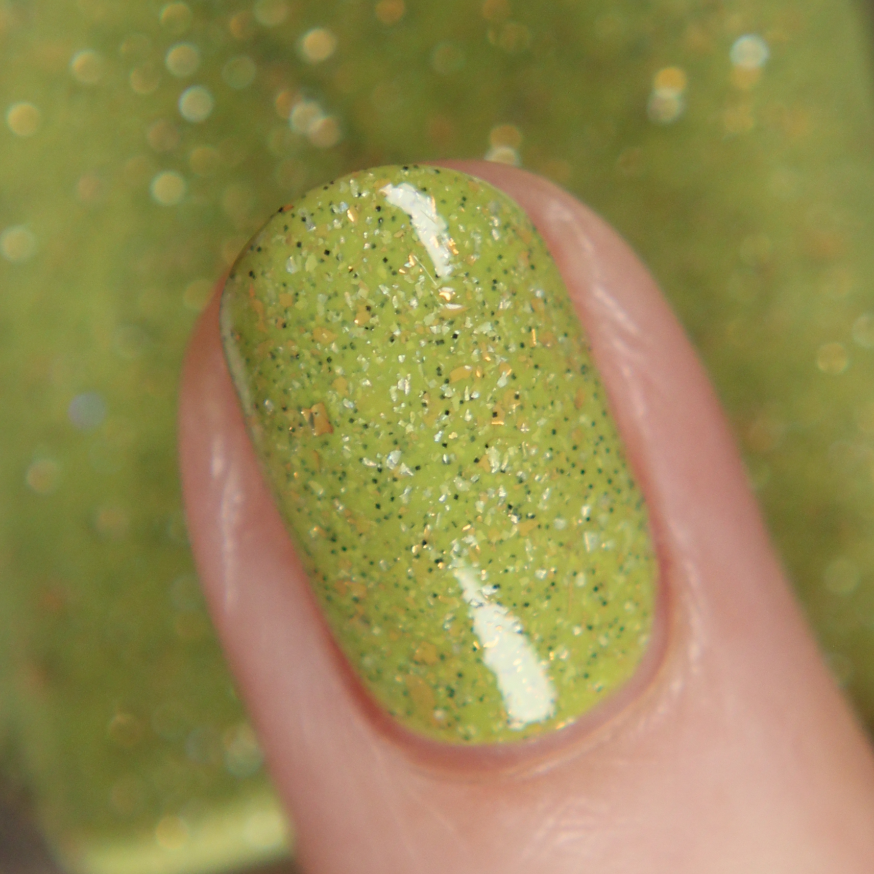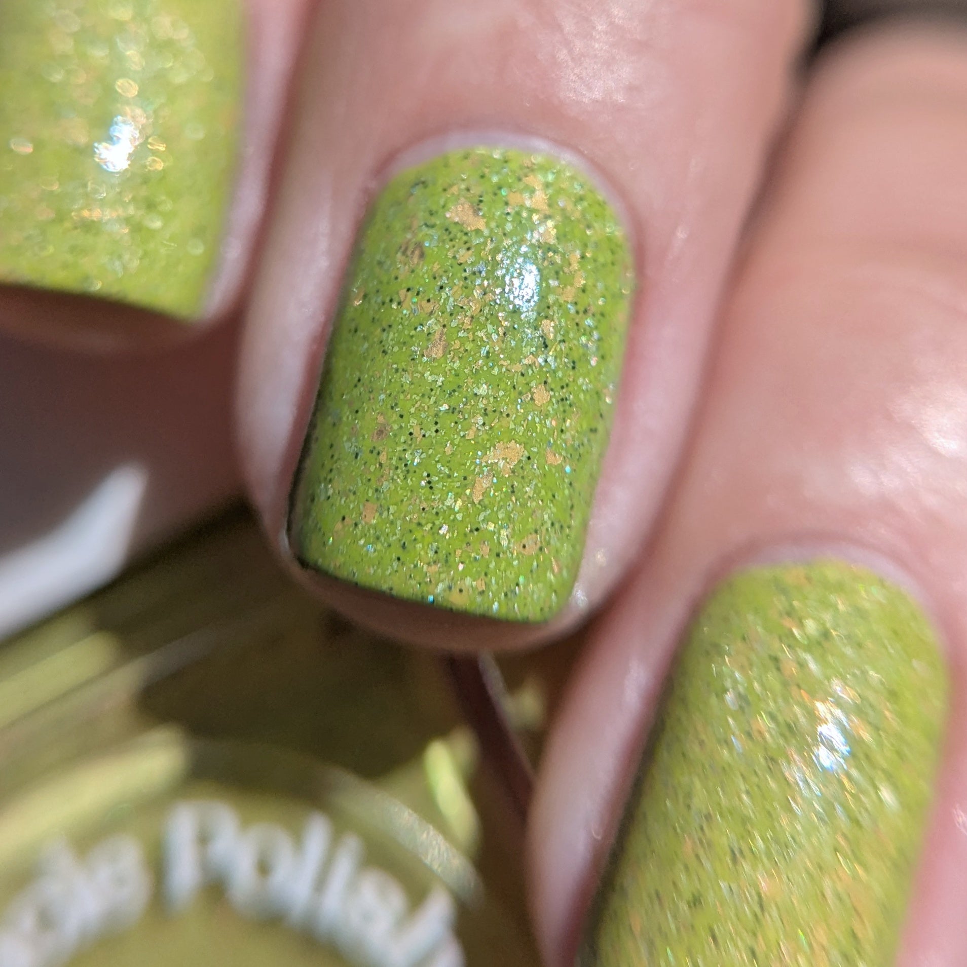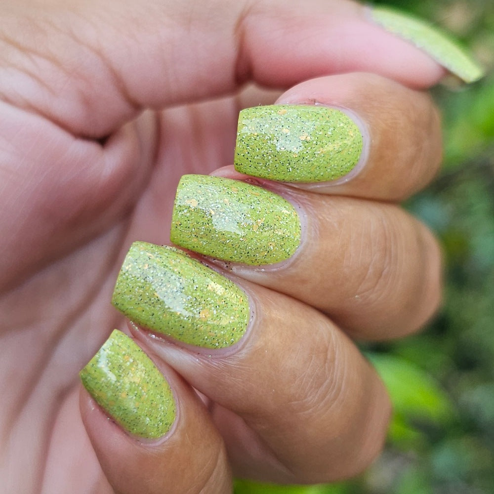 A bright apple green crelly base with gold metallic flakes, scattered holographic microflakes, and tiny black glitter.