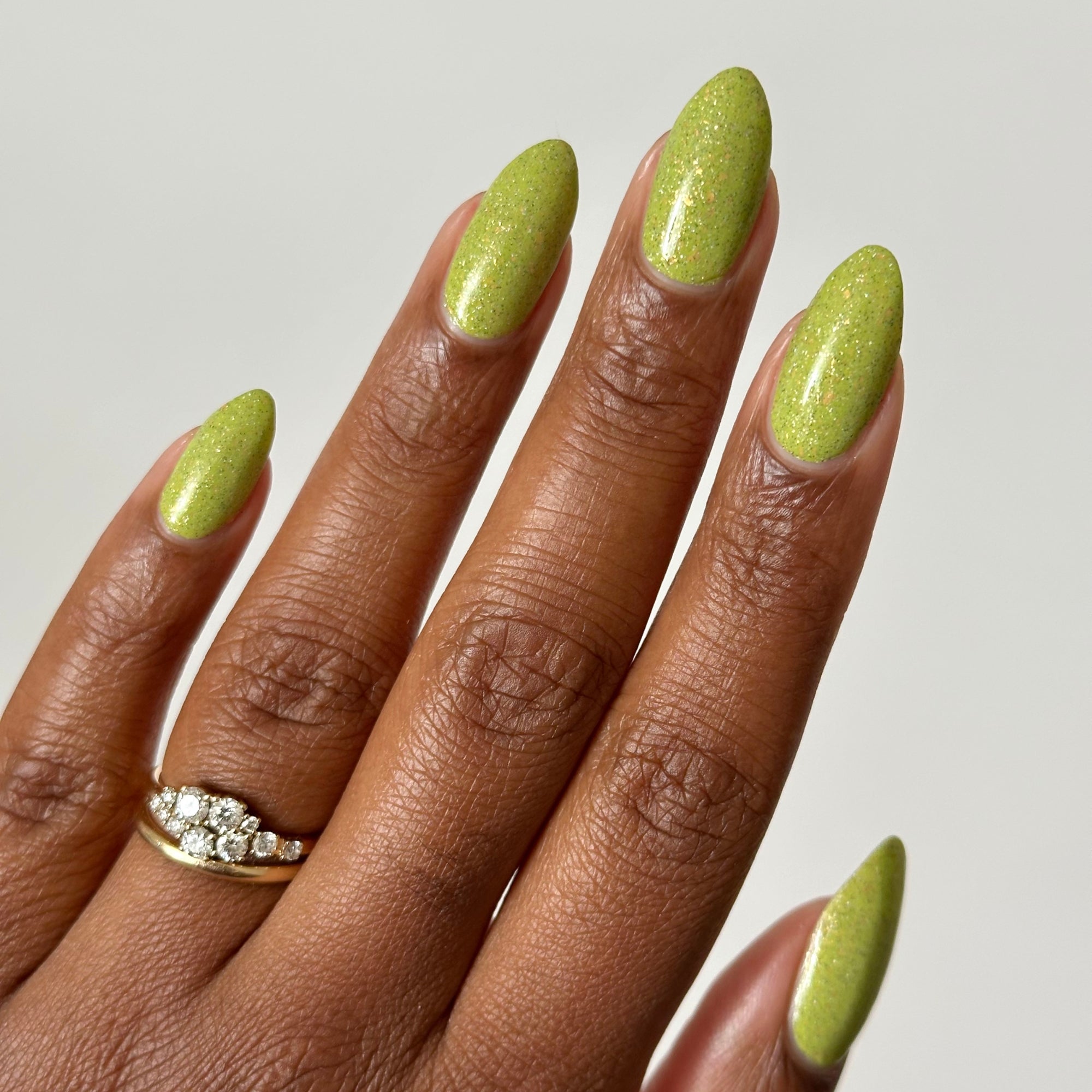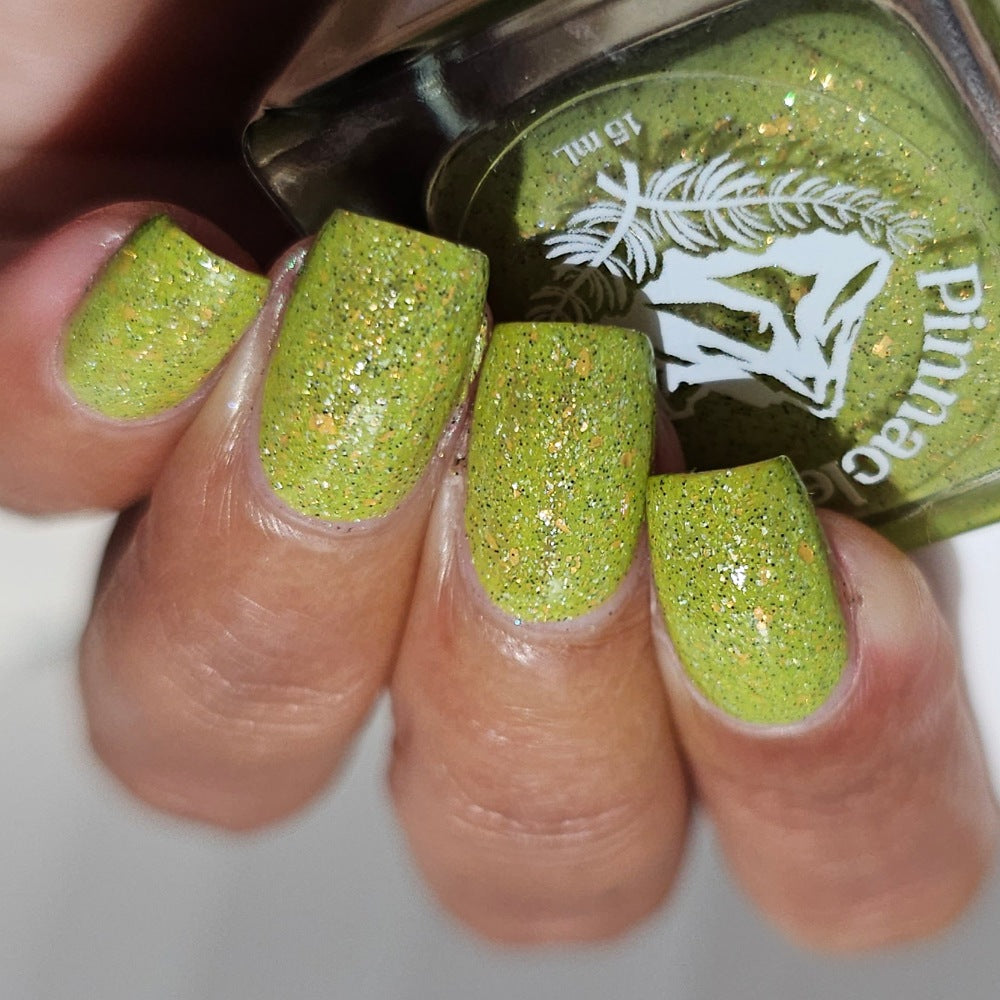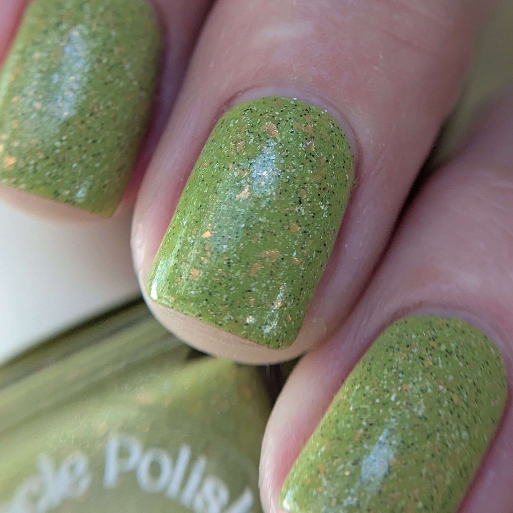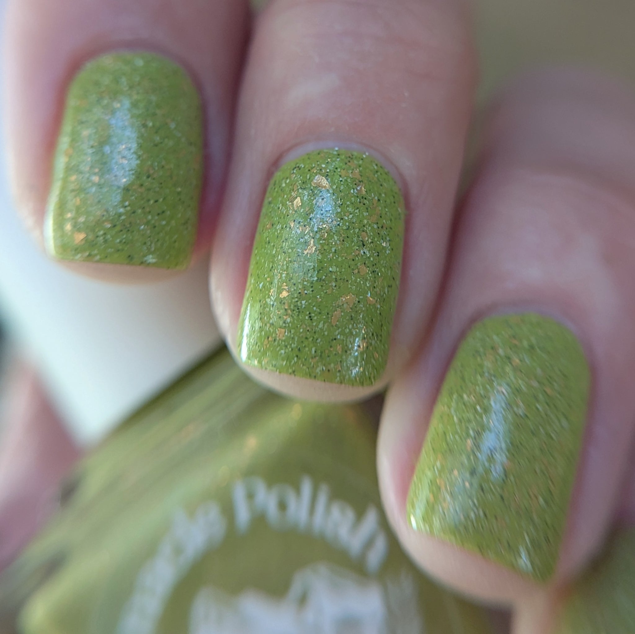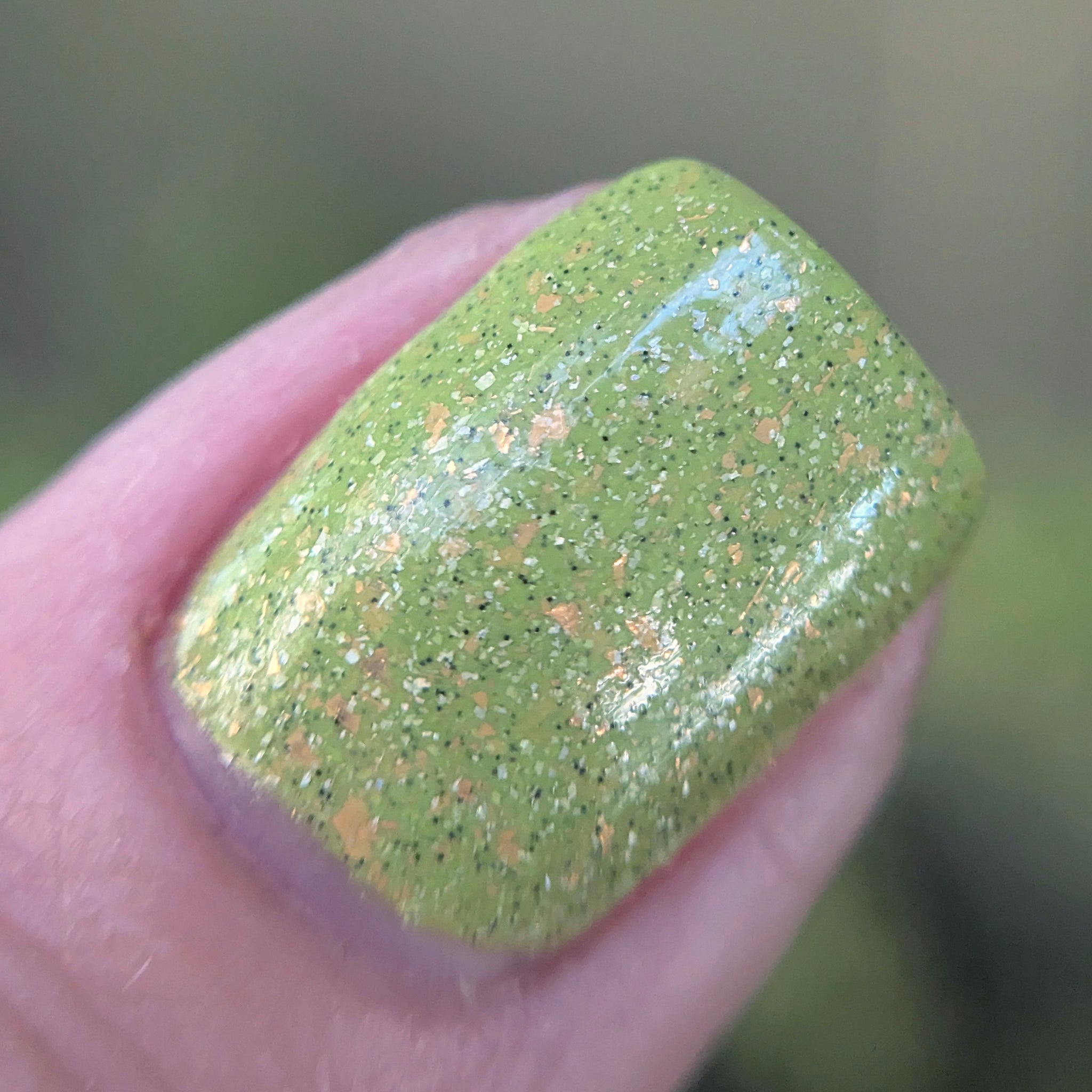 A bright apple green crelly base with gold metallic flakes, scattered holographic microflakes, and tiny black glitter.