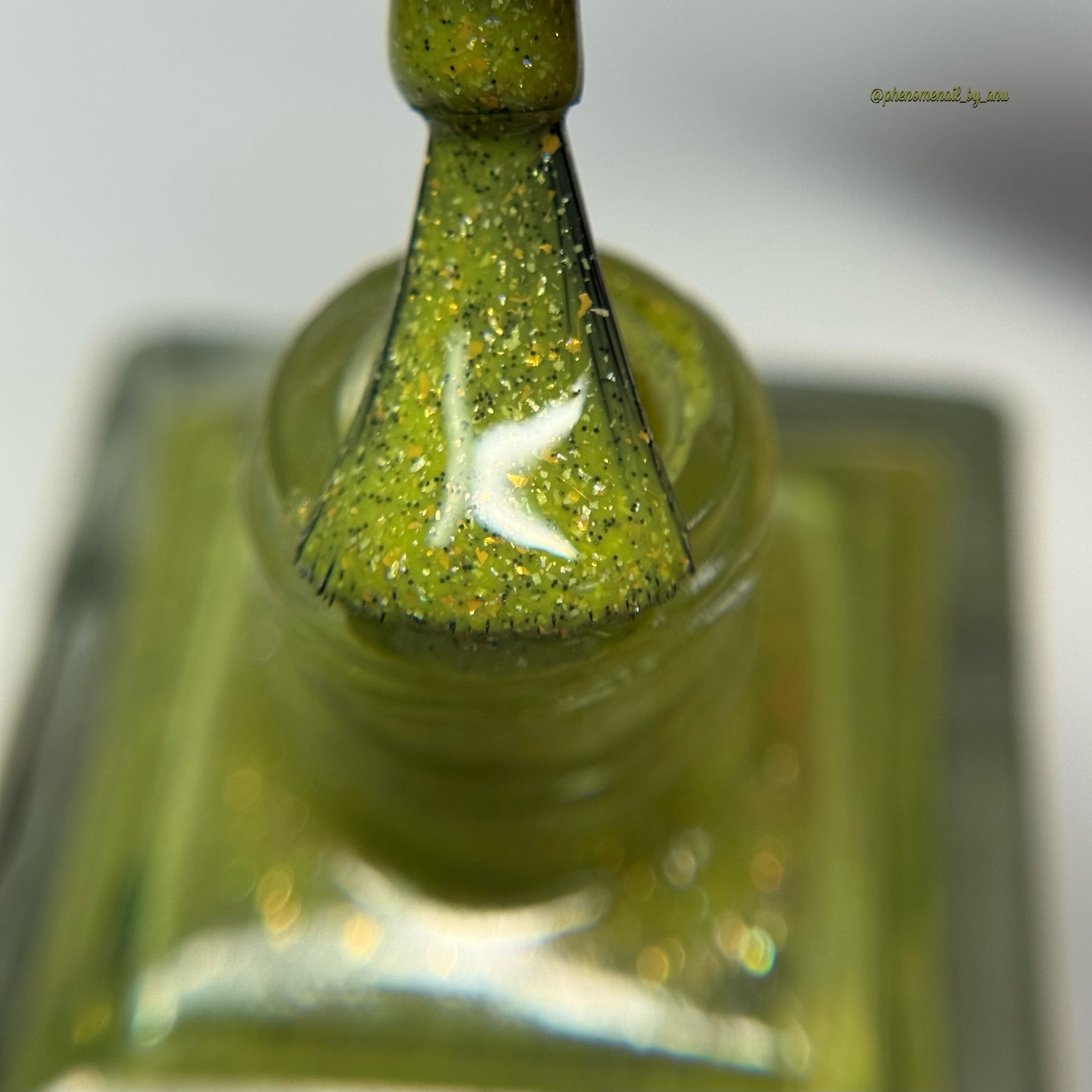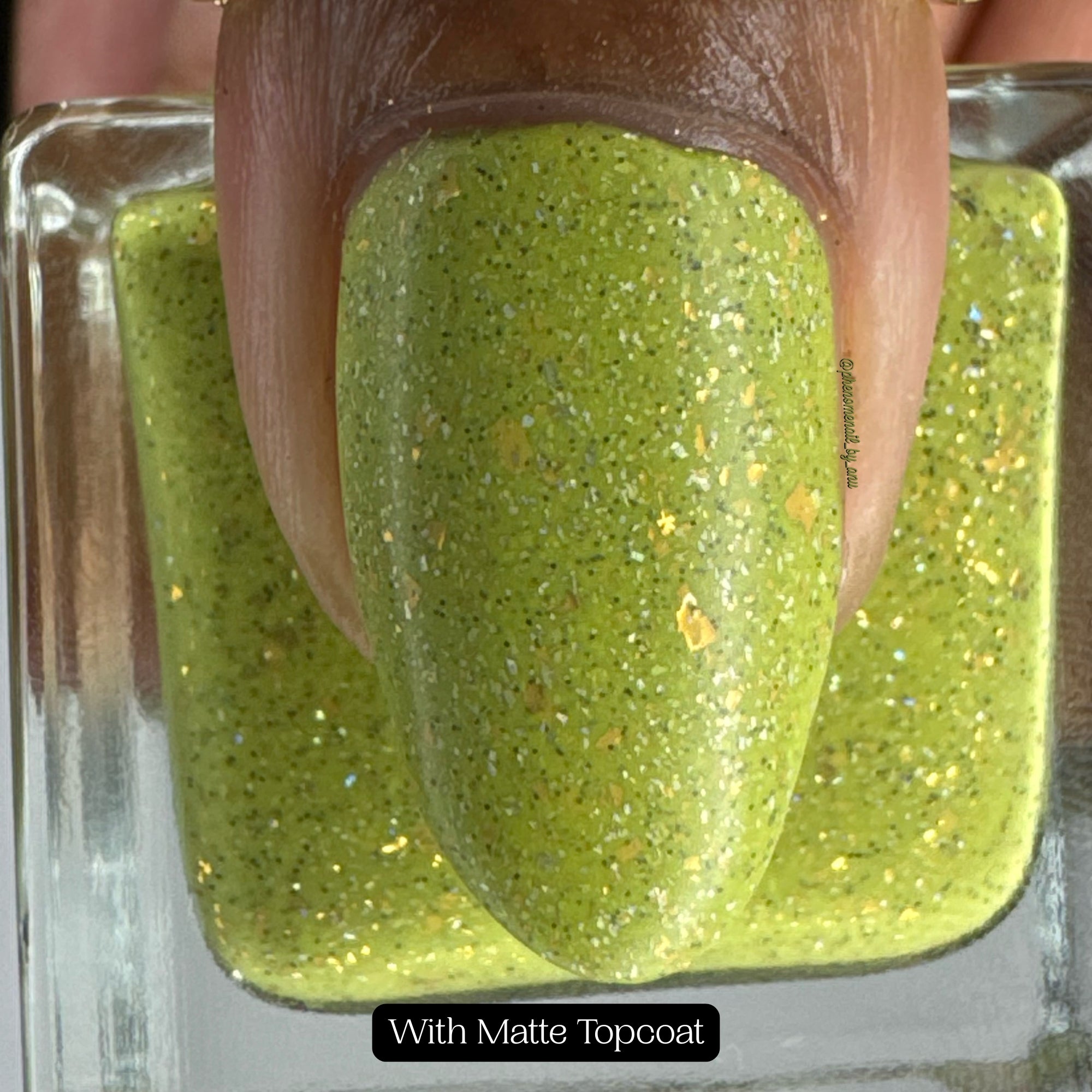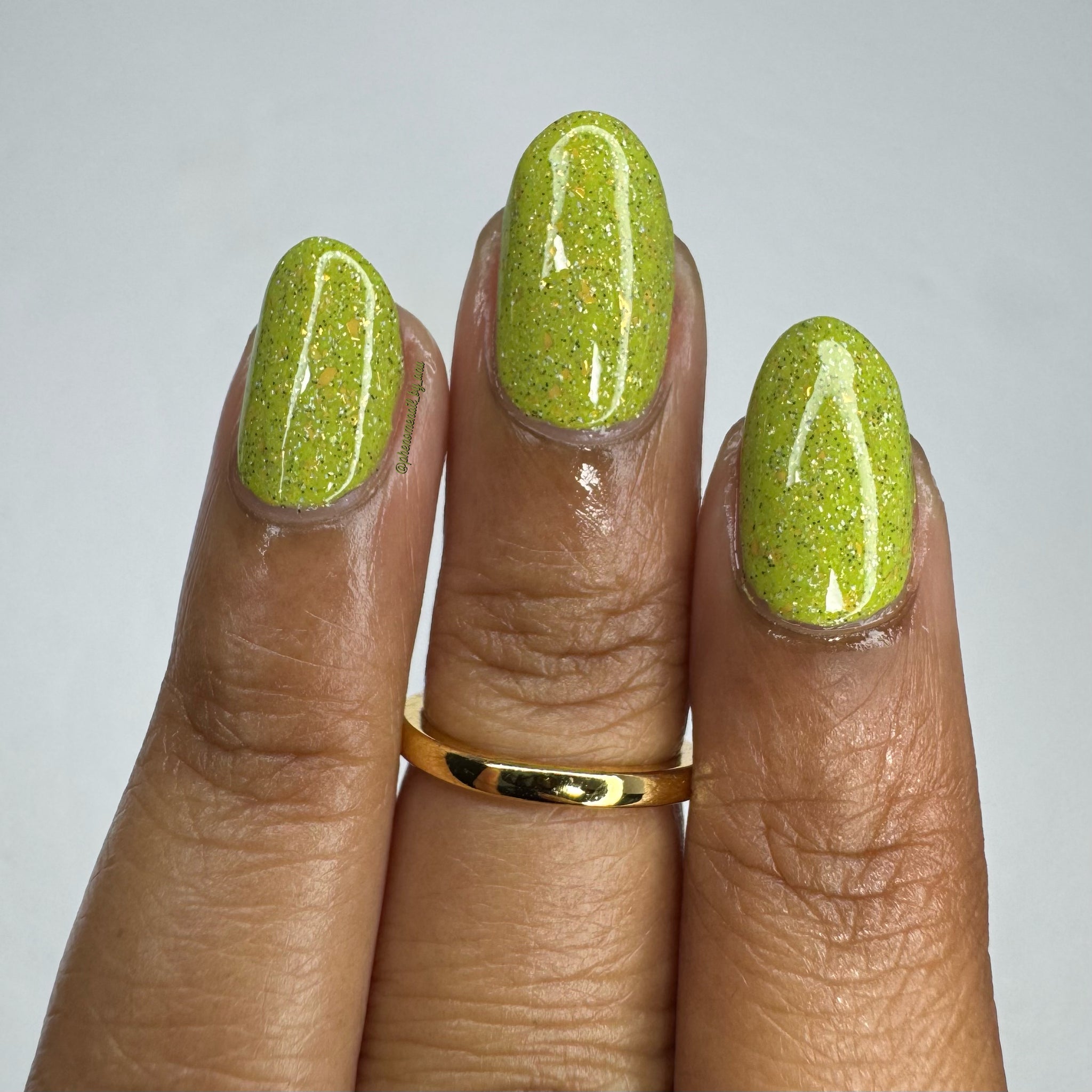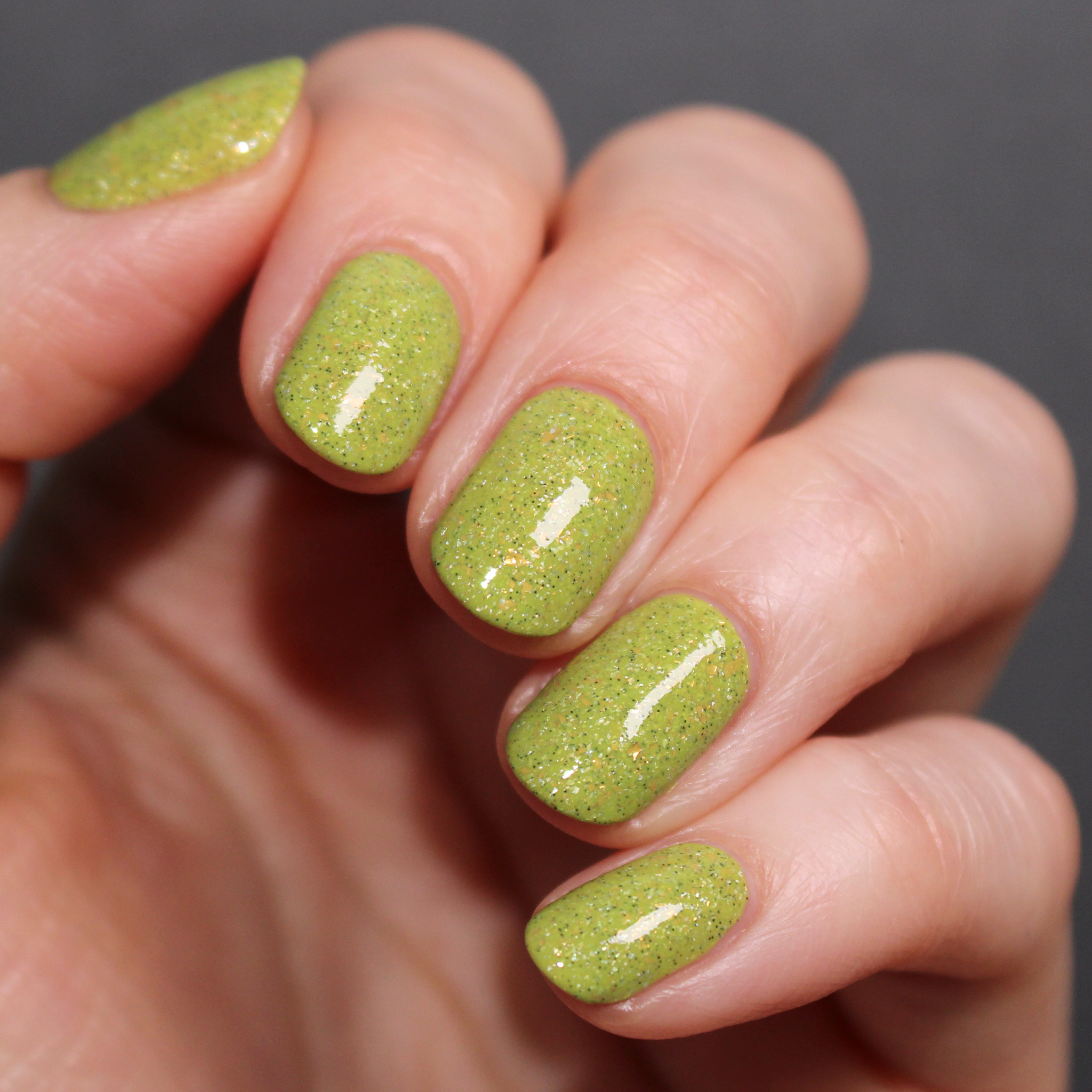 A bright apple green crelly base with gold metallic flakes, scattered holographic microflakes, and tiny black glitter.
