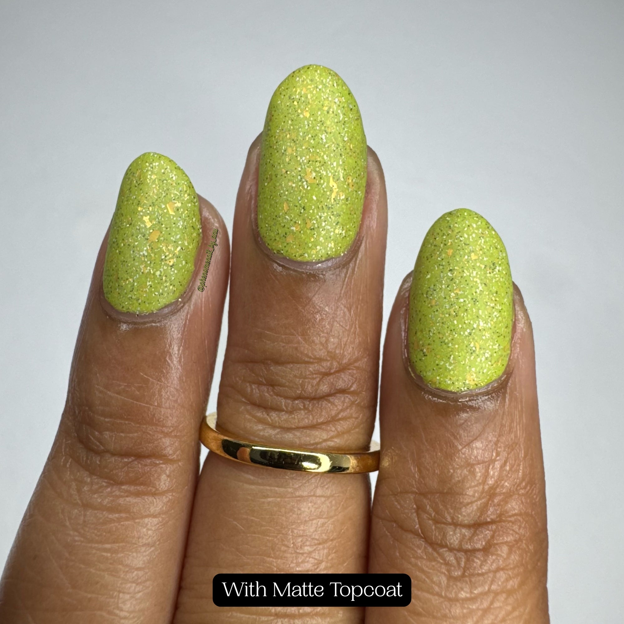 In order to let the contrast between the gold metallic and silver holo flakes show, the bases on these are more sheer than some of my other similar polishes.  You may prefer 3 coats for fuller coverage.  While the flakes in this polish are very thin and lie flat on the nail, the polish dries a bit dull without topcoat.