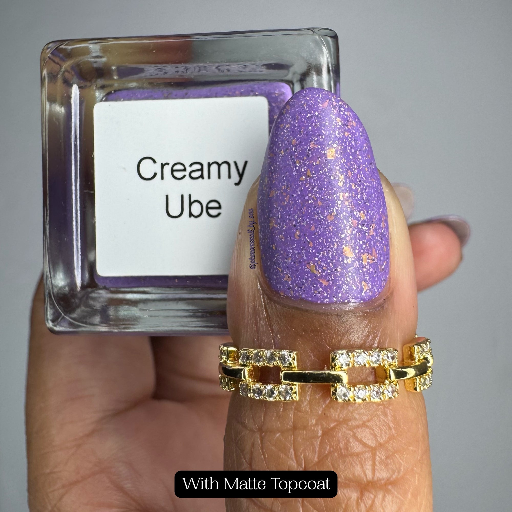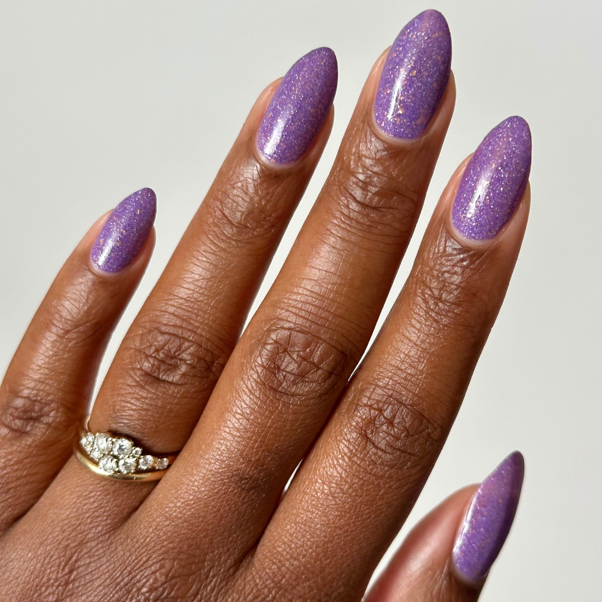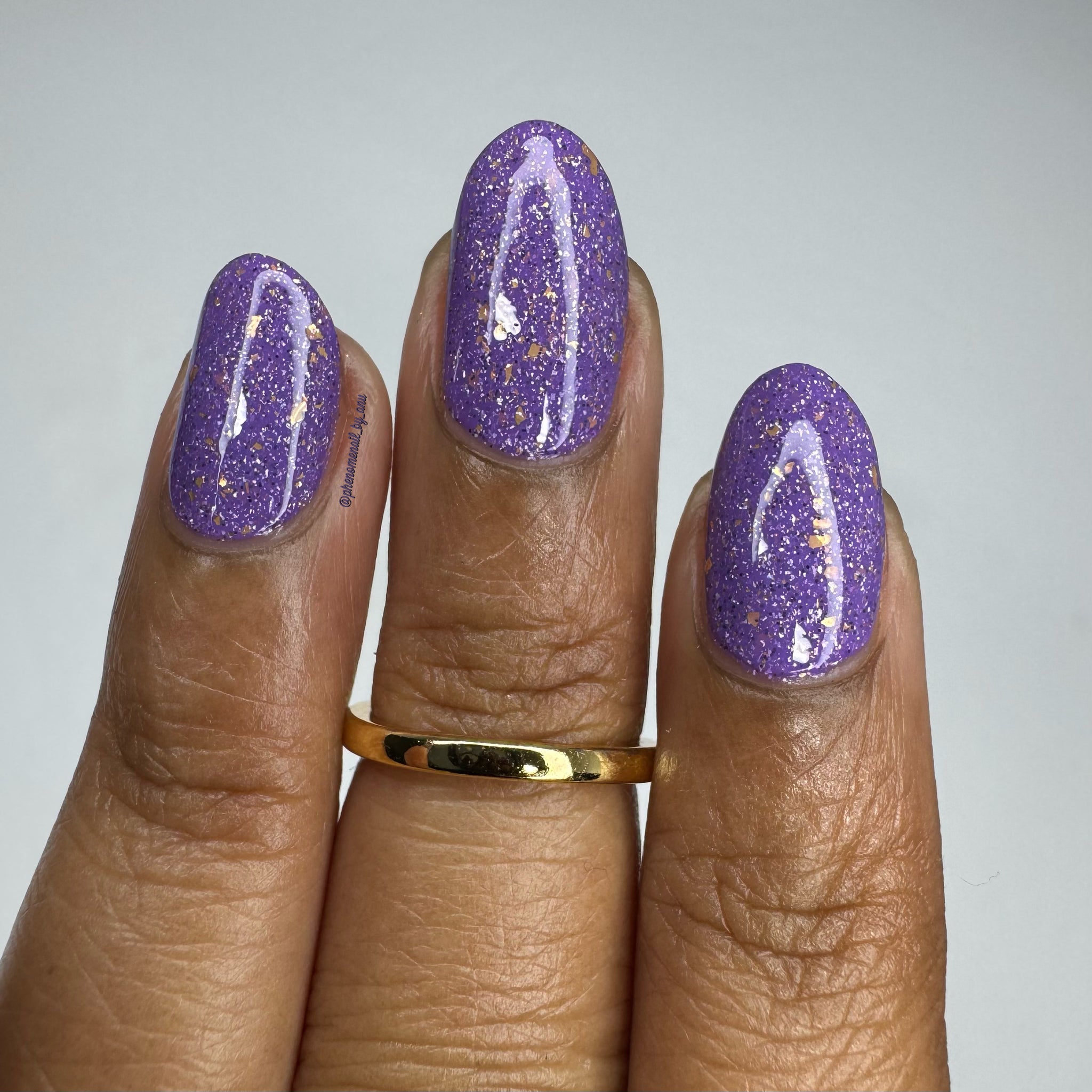 A cool violet crelly base with gold metallic flakes, scattered holographic microflakes, and tiny black glitter.
