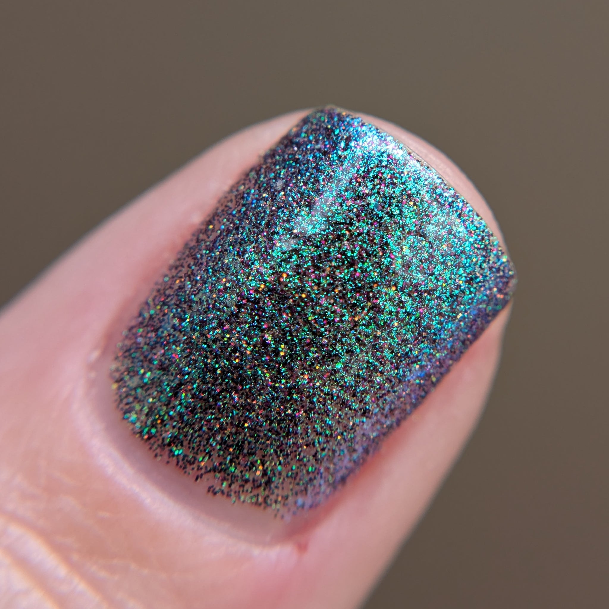 A clear base with teal shifting shimmer, burgundy metallic microglitter, and gold holographic microglitter. This polish can be layered for medium coverage in 2-3 coats, or used as a topper. Because of the glitter, it may dry a bit textured.  A "Glitter Grabbed" type topcoat can help to create a smoother finish.